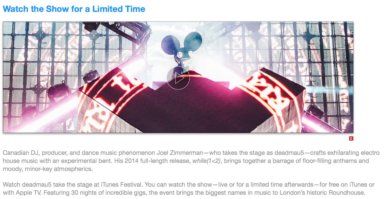 Get out your Apple device, like an iPad. Go to the link for the iTunes Festival in London . Search for the “deadmau5” link and click on it. It should take you to the iTunes Store and show an option to play a video for his recent performance in London. I hope you enjoy the show!