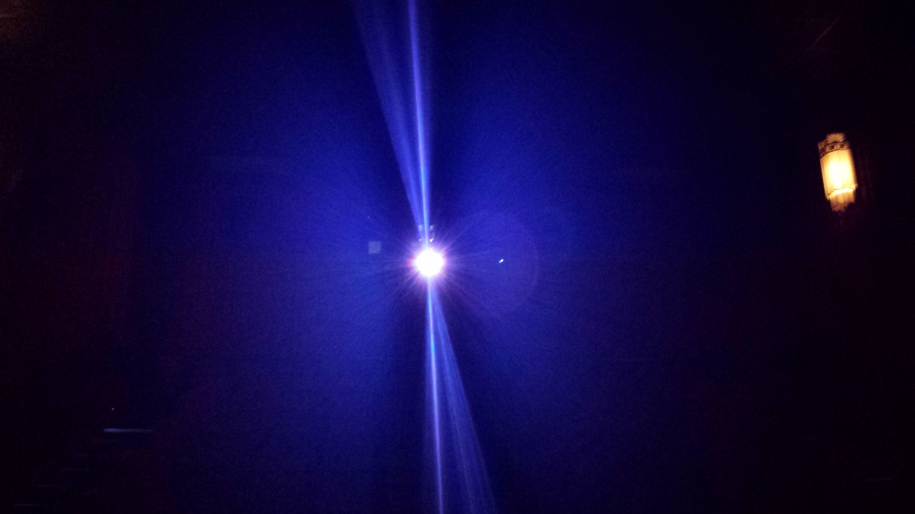 If you are feeling a little bit sick, and you think you might be catching a cold, then it is a good idea to go see a kids movie (or to rent a movie, or to watch one on television) to lift your spirits. When the movie is over, it is not necessarily a good idea to walk to the very front and take a photo while facing the projector. If you attempt this, then please bring sunglasses. 🙂