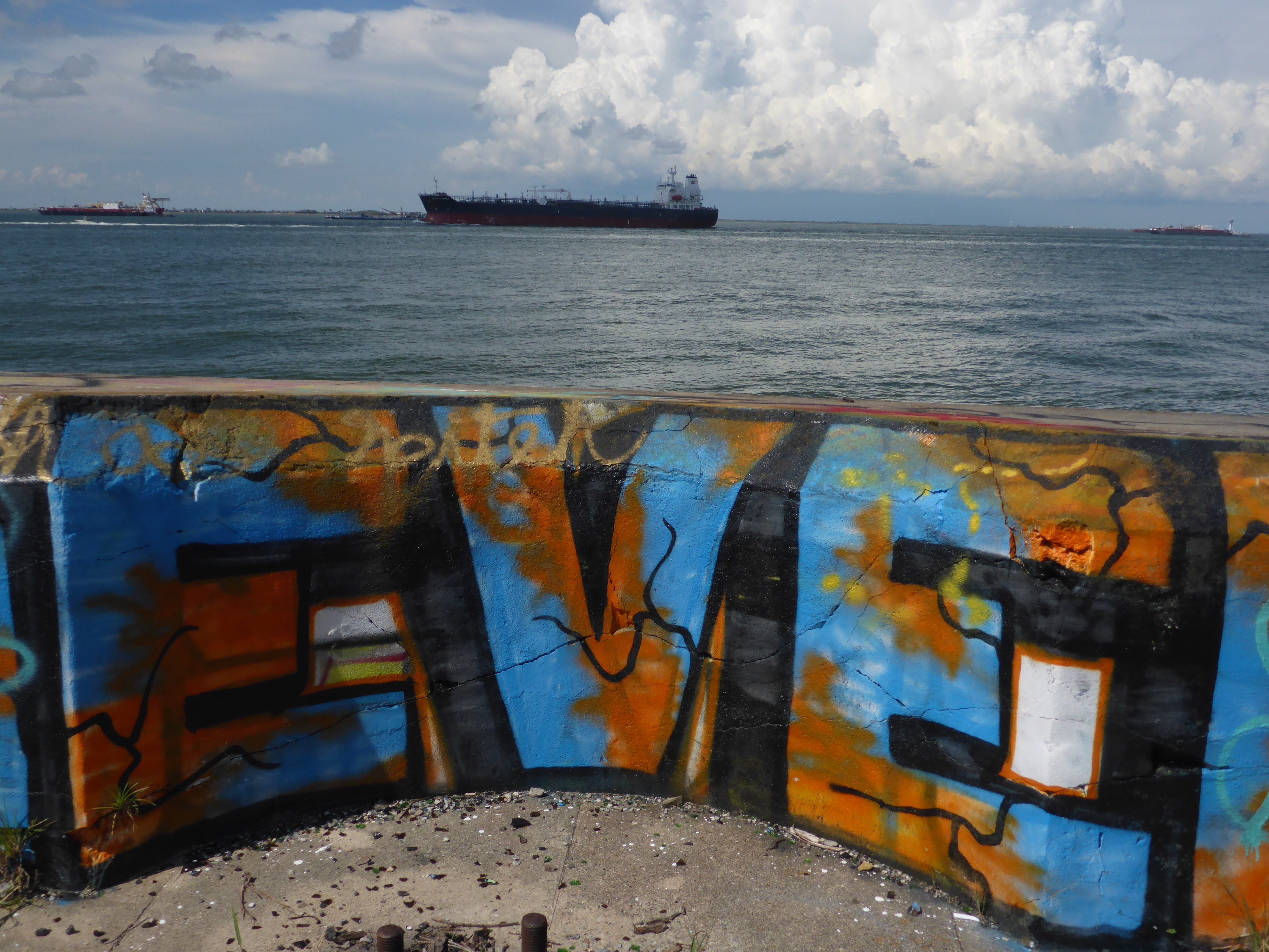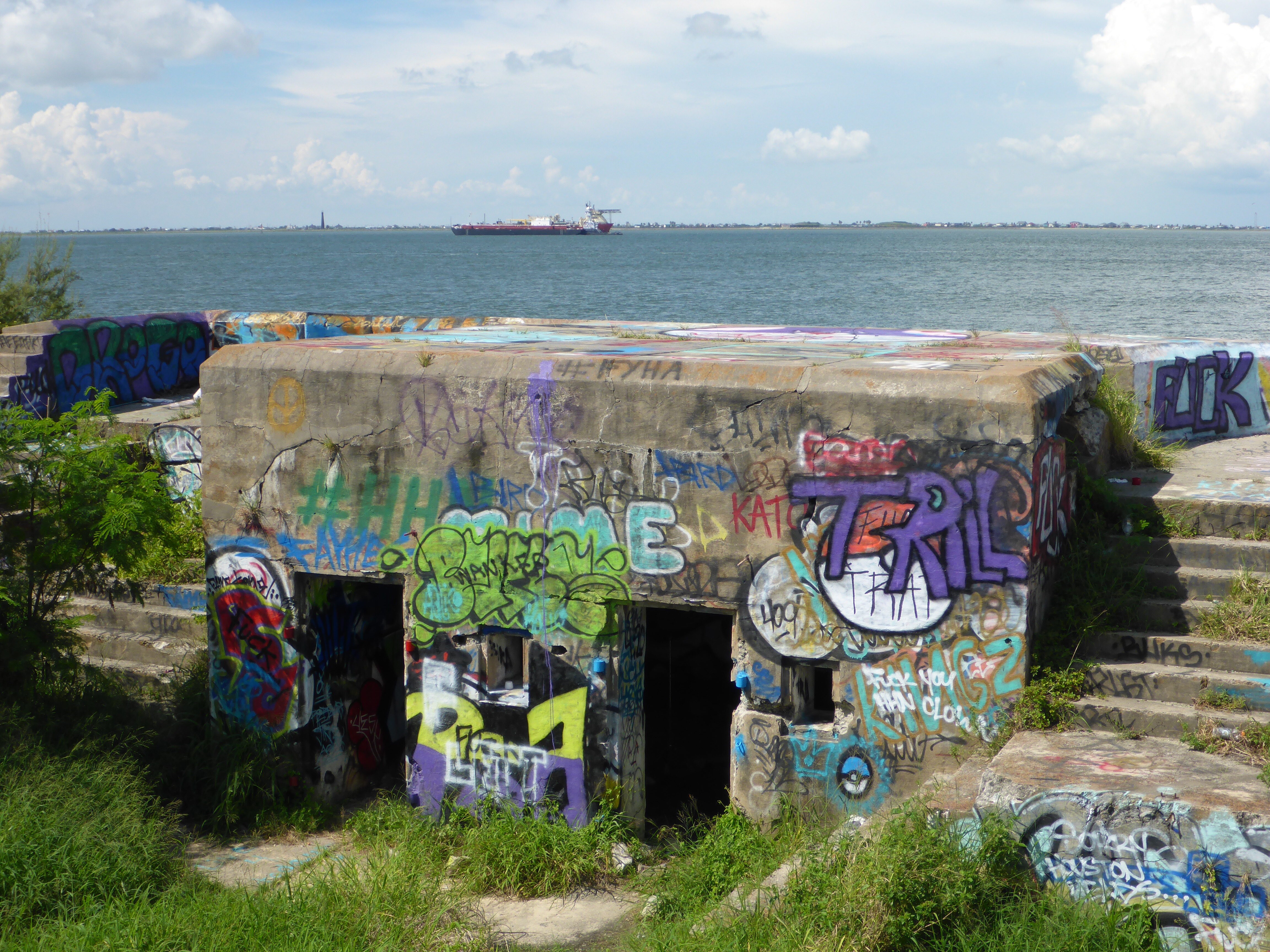 Fort San Jacinto Historic Site is a ruin of a defensive position located overlooking the Ship Channel. To get there, just take Seawall Blvd all the way to the end where you will find a parking lot with great views of the shipping lanes. There is an old gun emplacement right there in the parking area that you can climb on. For the brave, you can head down to the shore and scramble across the rocks for a long ways in the Galveston sunshine. Eventually, you will run across the ruins. I was hoping for cool graffiti, but found a lot of scary stuff instead. There were a few pieces I liked, but this is probably not a nice picnic spot despite the awesome views from on top of the old fort.