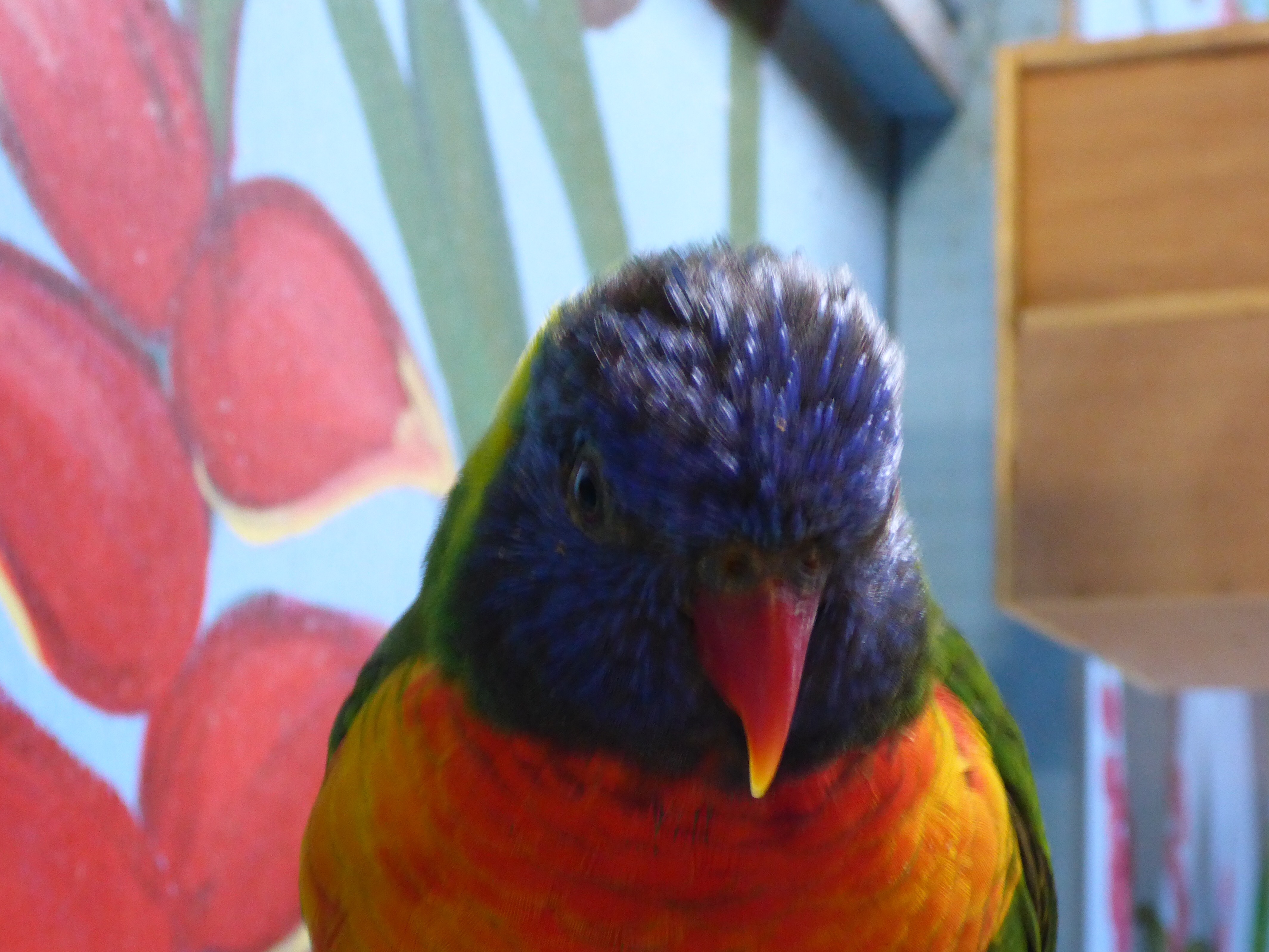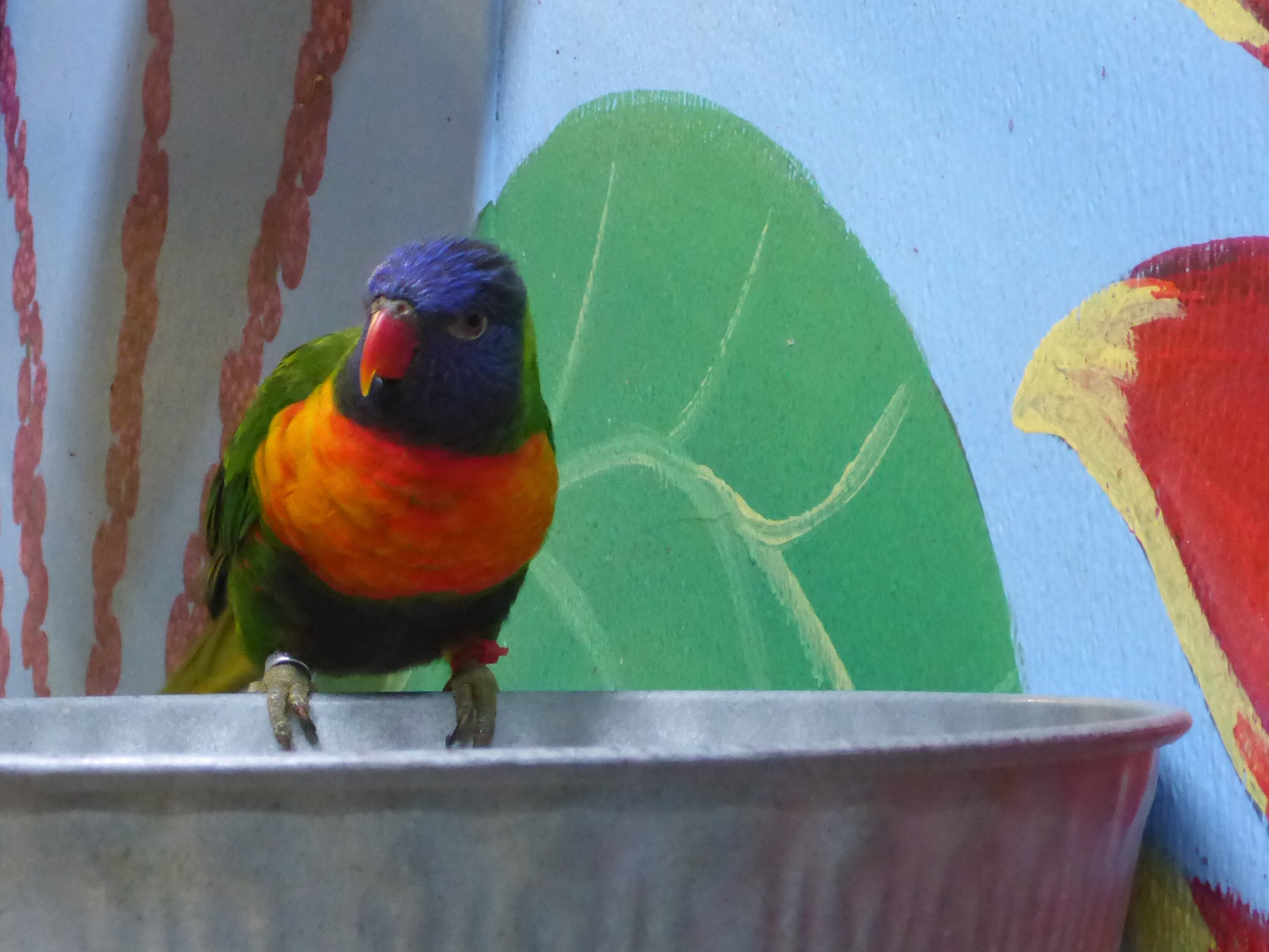 My all time favorite creatures at the Austin Aquarium are the Rainbow Lorikeets. They love to examine you and your belongings up close. They will land on you in a friendly way and check you out. They seem to be always in motion, making it challenging to get a good photo. My small camera is interesting to them, so they usually want to experience it by touching it with their beaks. I will normally try to spend as much time as possible inside their enclosure at the Aquarium. It is so much fun to hang out with these awesome birds.