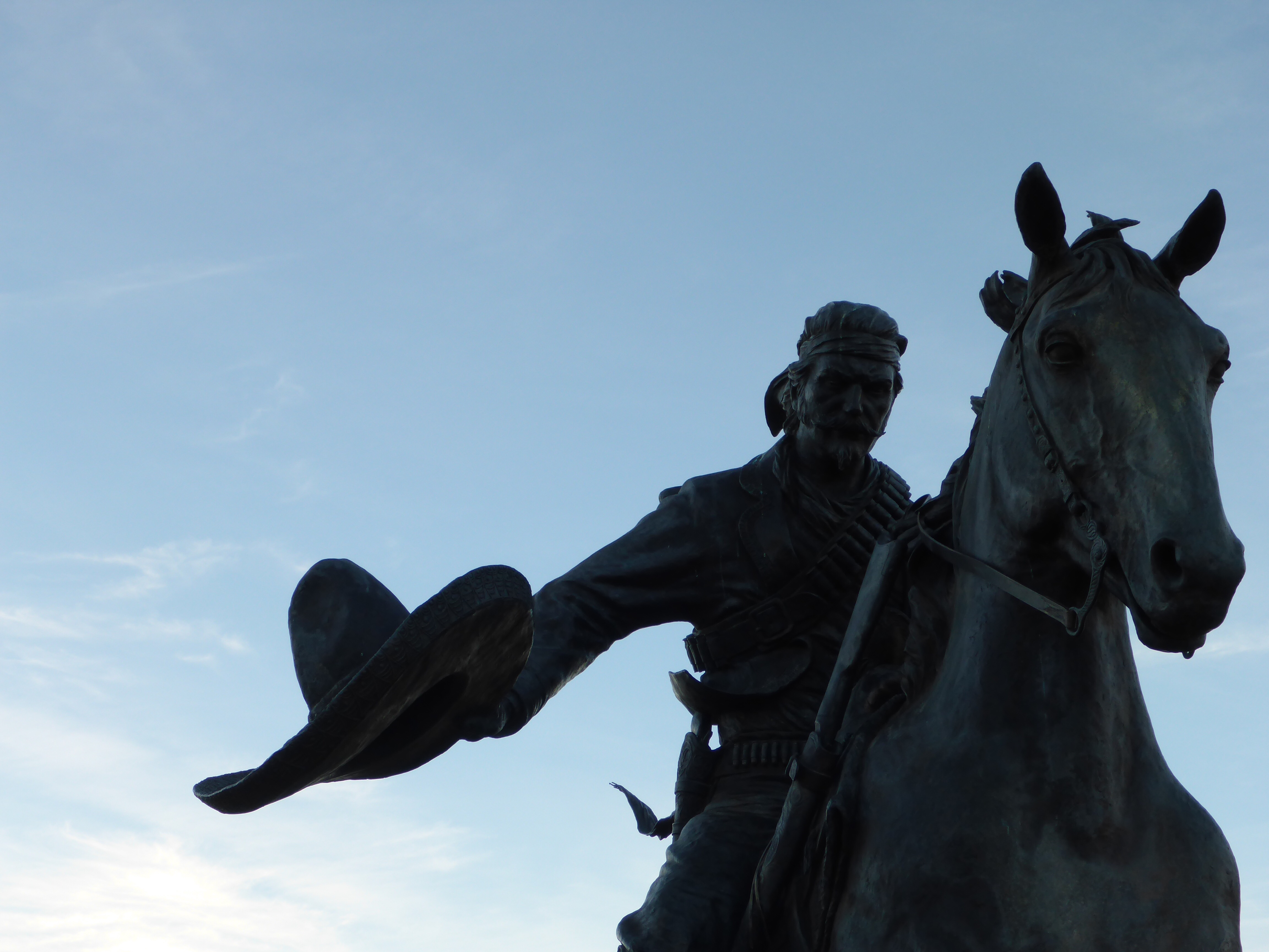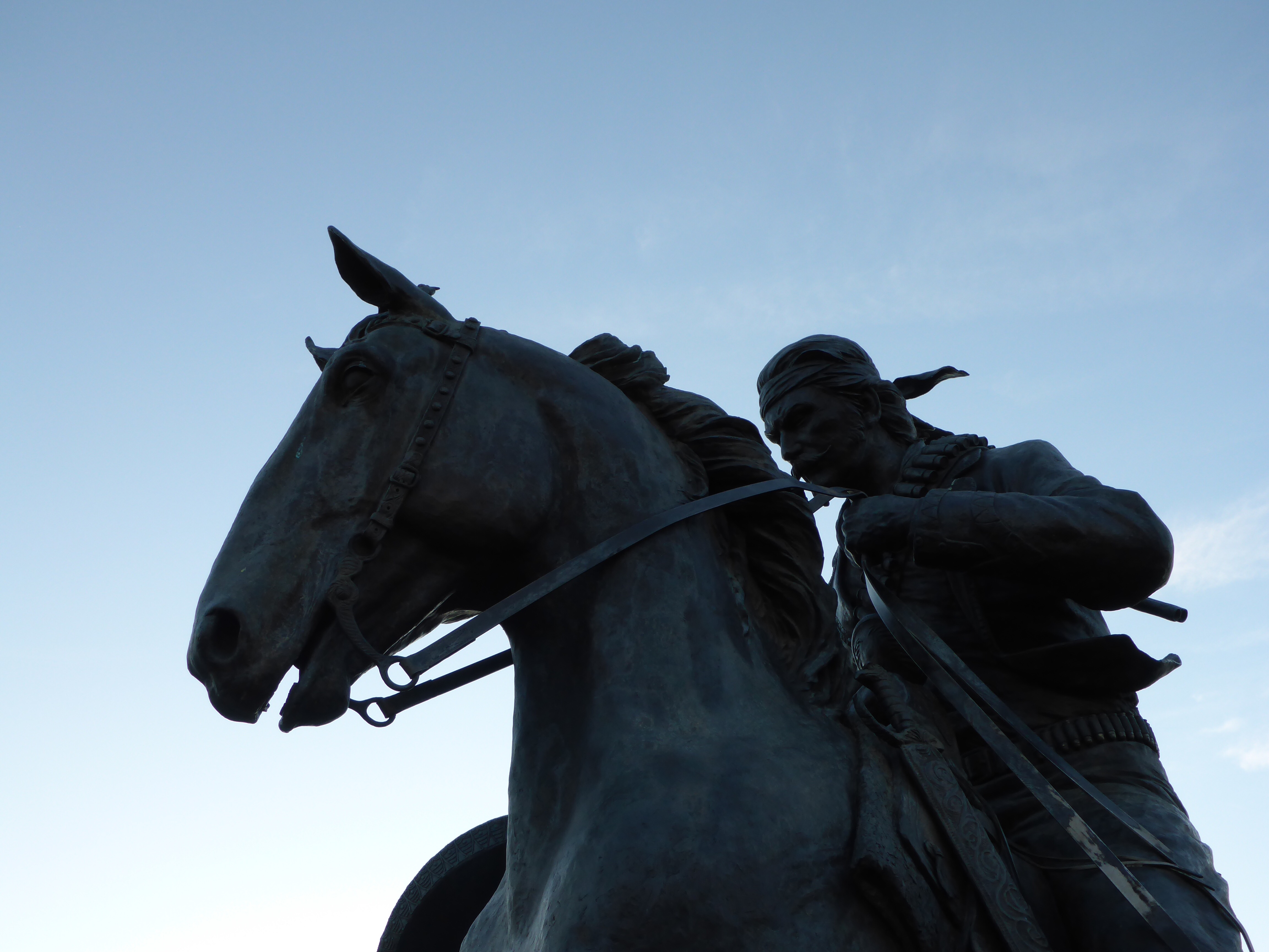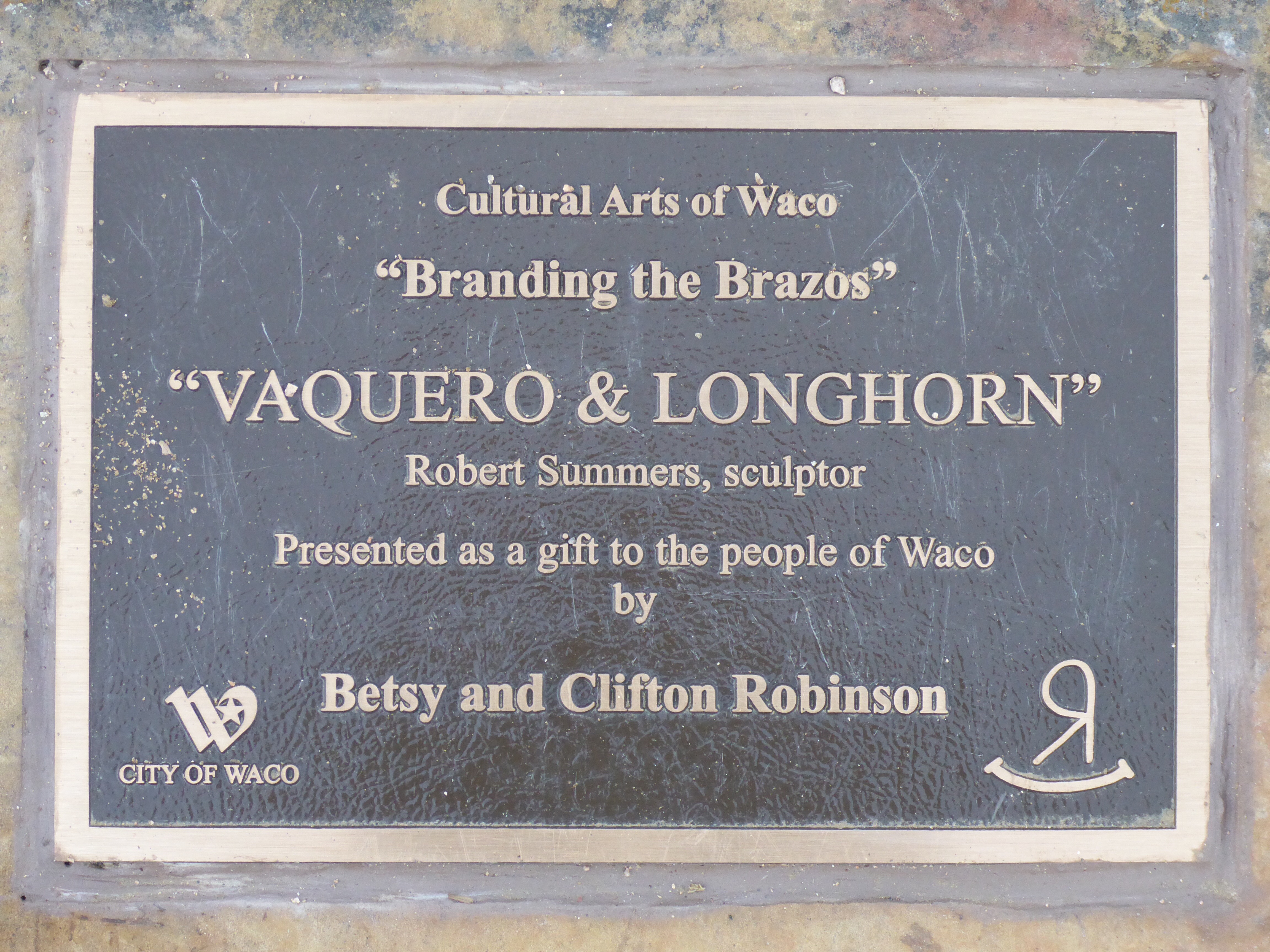 This Sculpture, among others, can be found at the end of the Waco Suspension Bridge. It is a great depiction of a Vaquero herding some longhorn cattle.