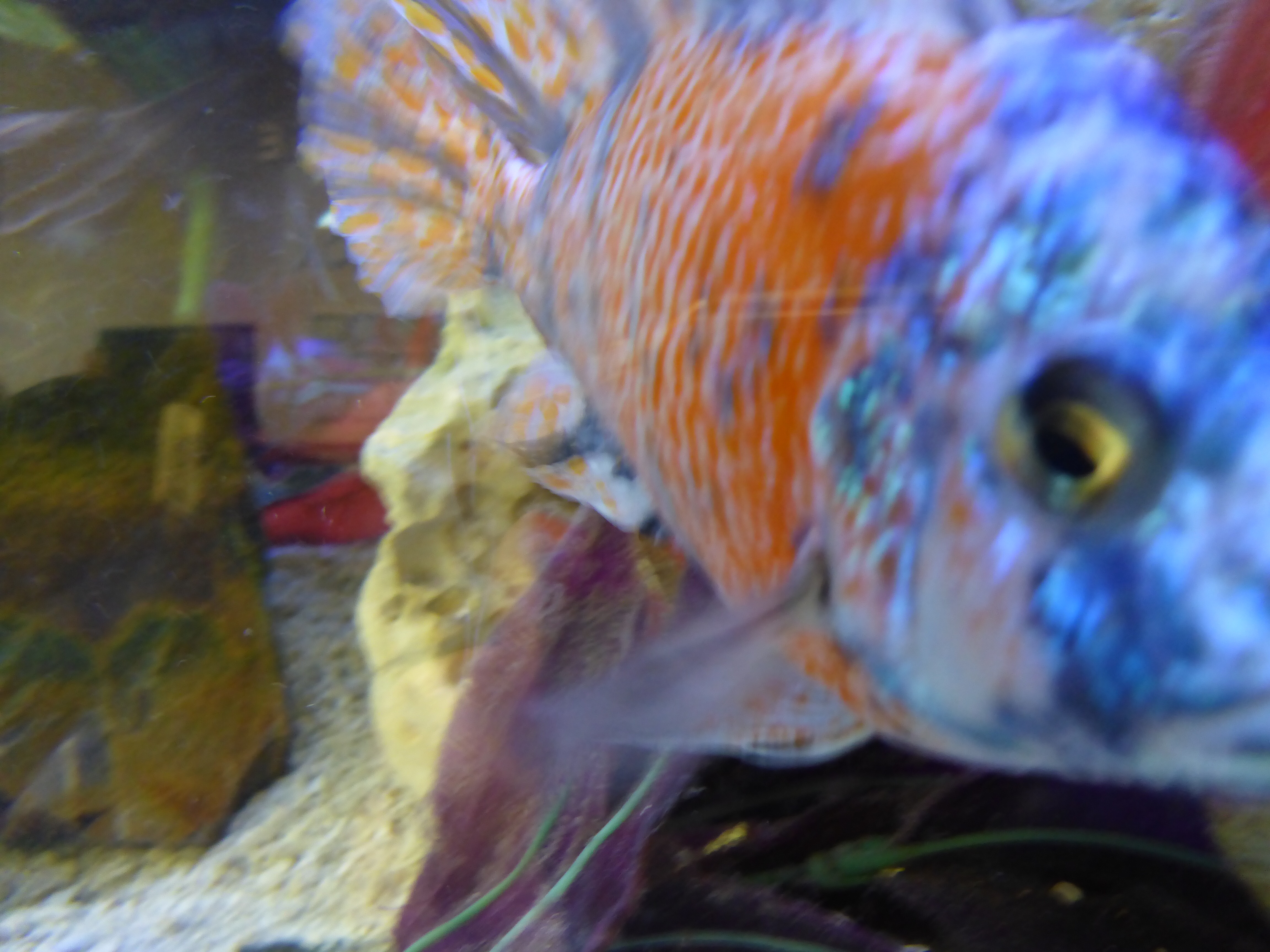 Although beautifully colored, this fish was too fast for photos. I had to take my car to the shop this morning, and this guy was hanging out in the waiting room. His mission was that of destruction. He wasn’t happy with his current environment, so he decided to change things one rock at a time. In the top photo, you can see where he has dug a hole in the aquarium all the way to the bottom and upended some plants along the way. He would swoop in, pick up a rock in his mouth, and then swim over to the side and spit it out. He was a nonstop blur of rock transplantation. :-O