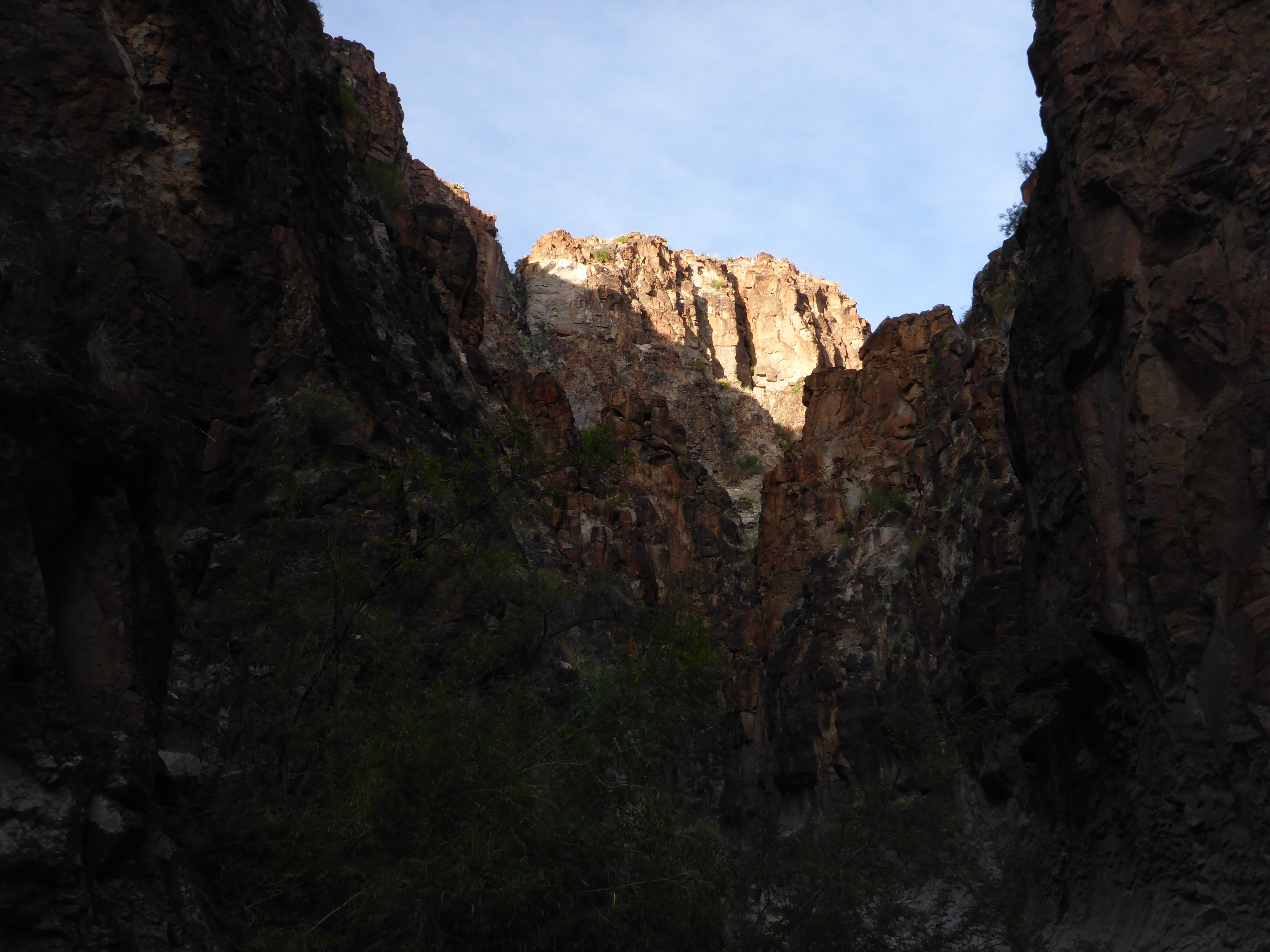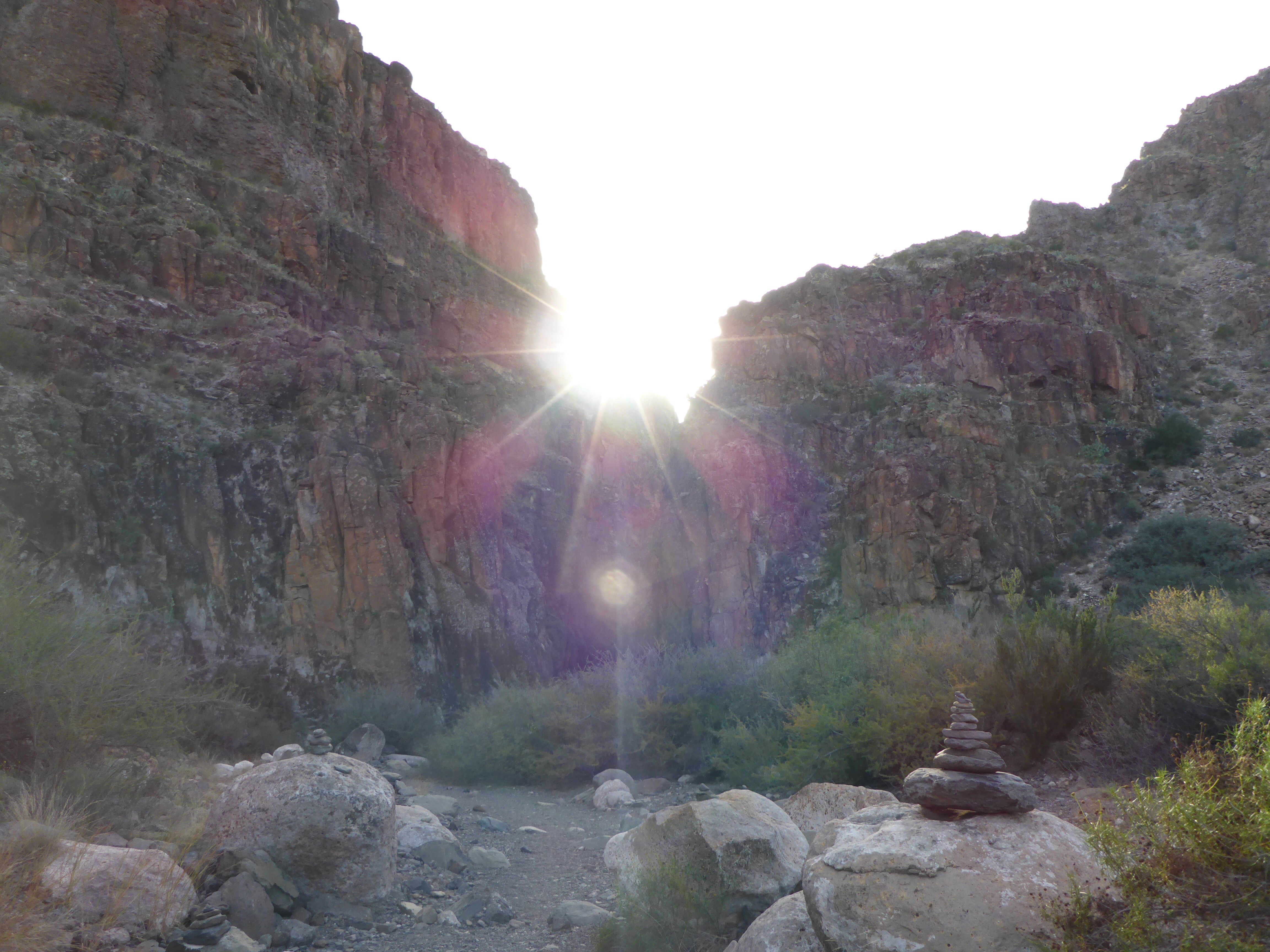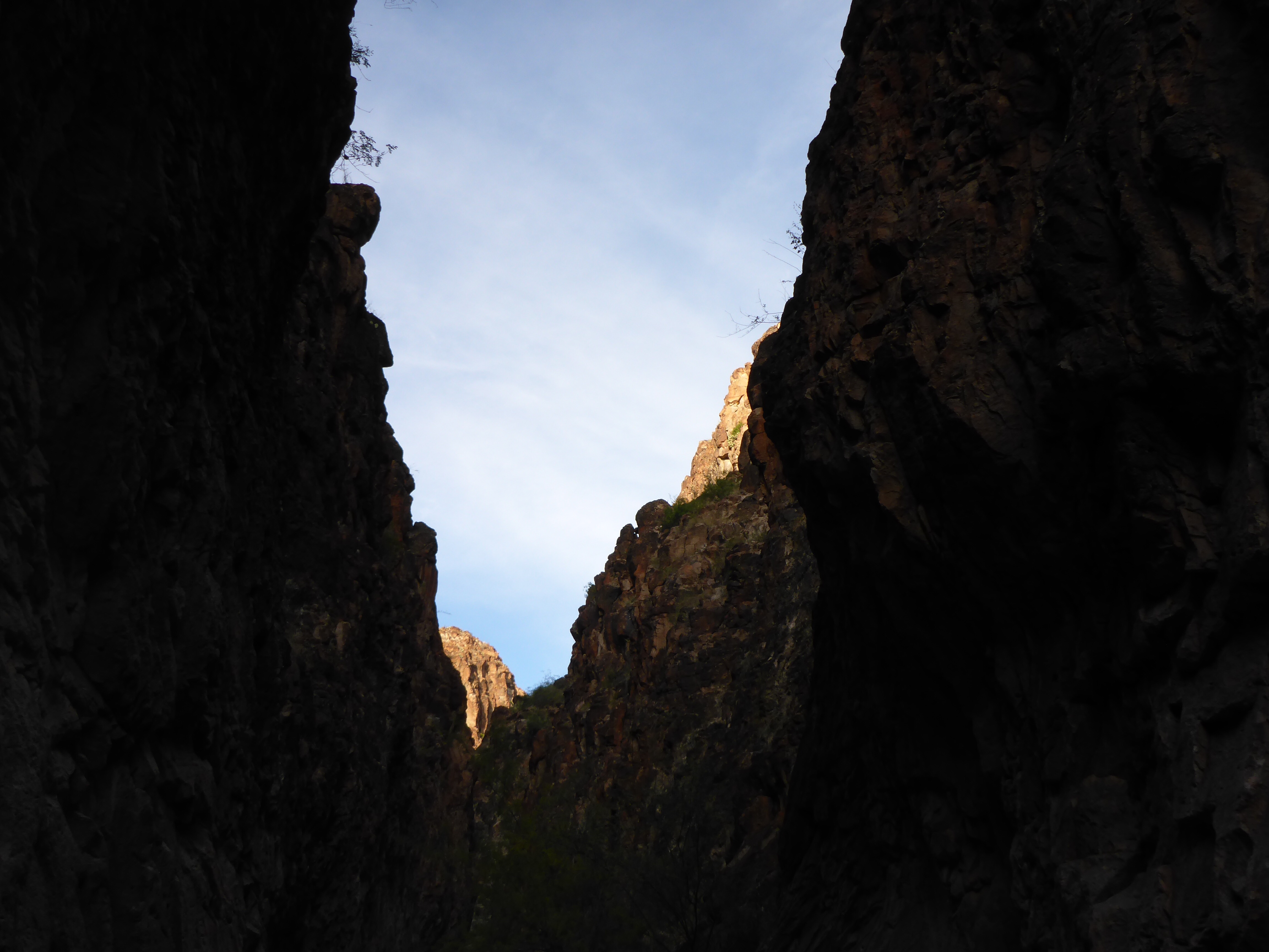 This hike through a slot canyon was a great experience. It was wonderful to feel enclosed with high canyon walls on either side. At times, I had to scramble down rock formations to continue onward. There was only the sound of the crunching of sand and gravel beneath my hiking boots. The sun was getting close to setting, the temperature was cooler in the shadows, and around each new corner was a surprise. Every few steps was a grand photo opportunity. 🙂