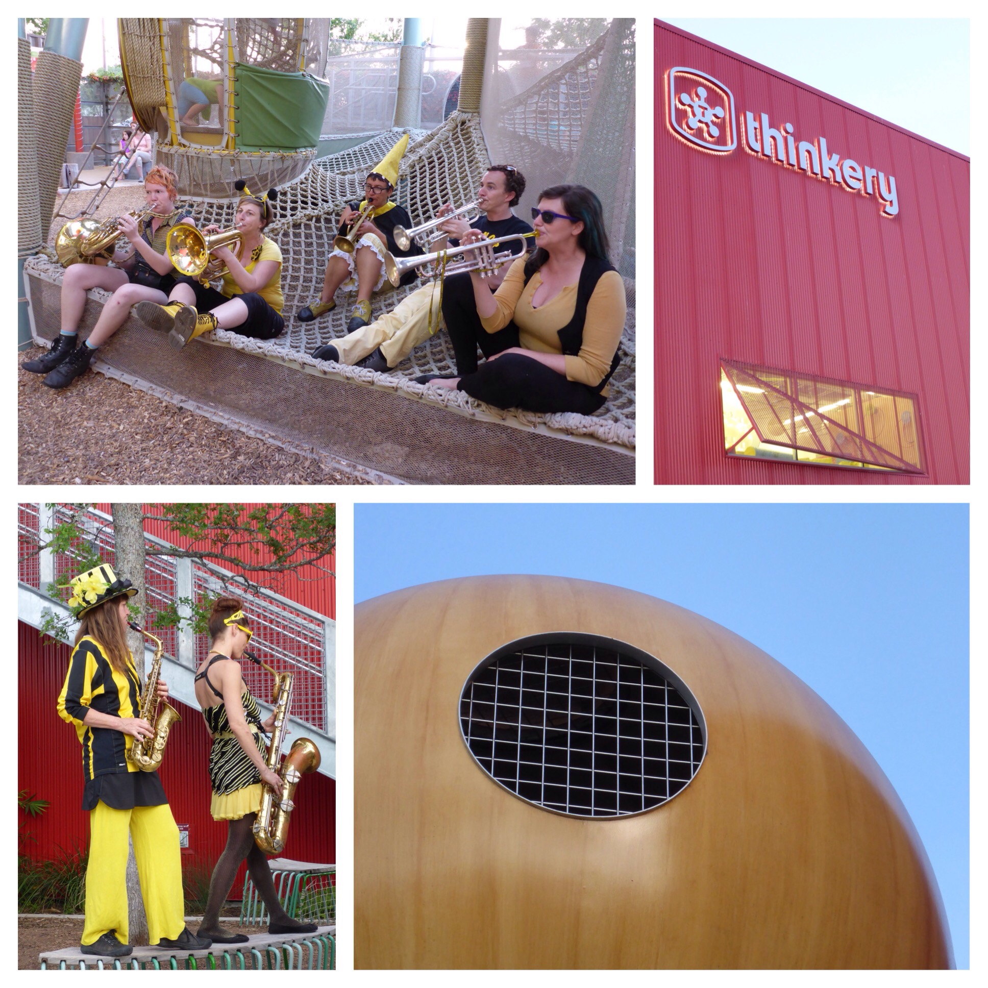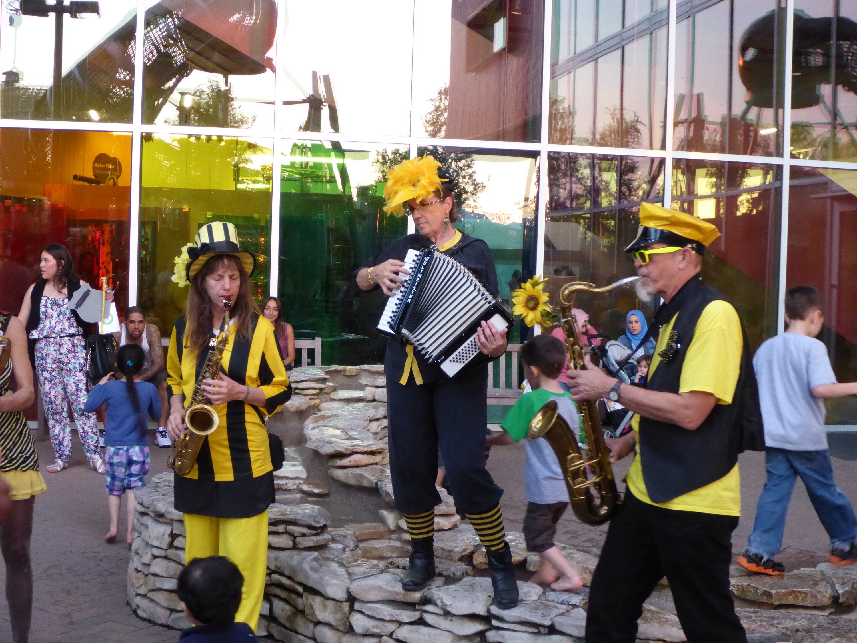 I went back to the Thinkery to watch the Minor Mishap Marching Band perform. They are so much fun. According to their website, “Minor Mishap Marching Band is known for their shenanigans, their black and yellow costumes, and their fun-loving exuberance.” Totally true, and they play great music together too.