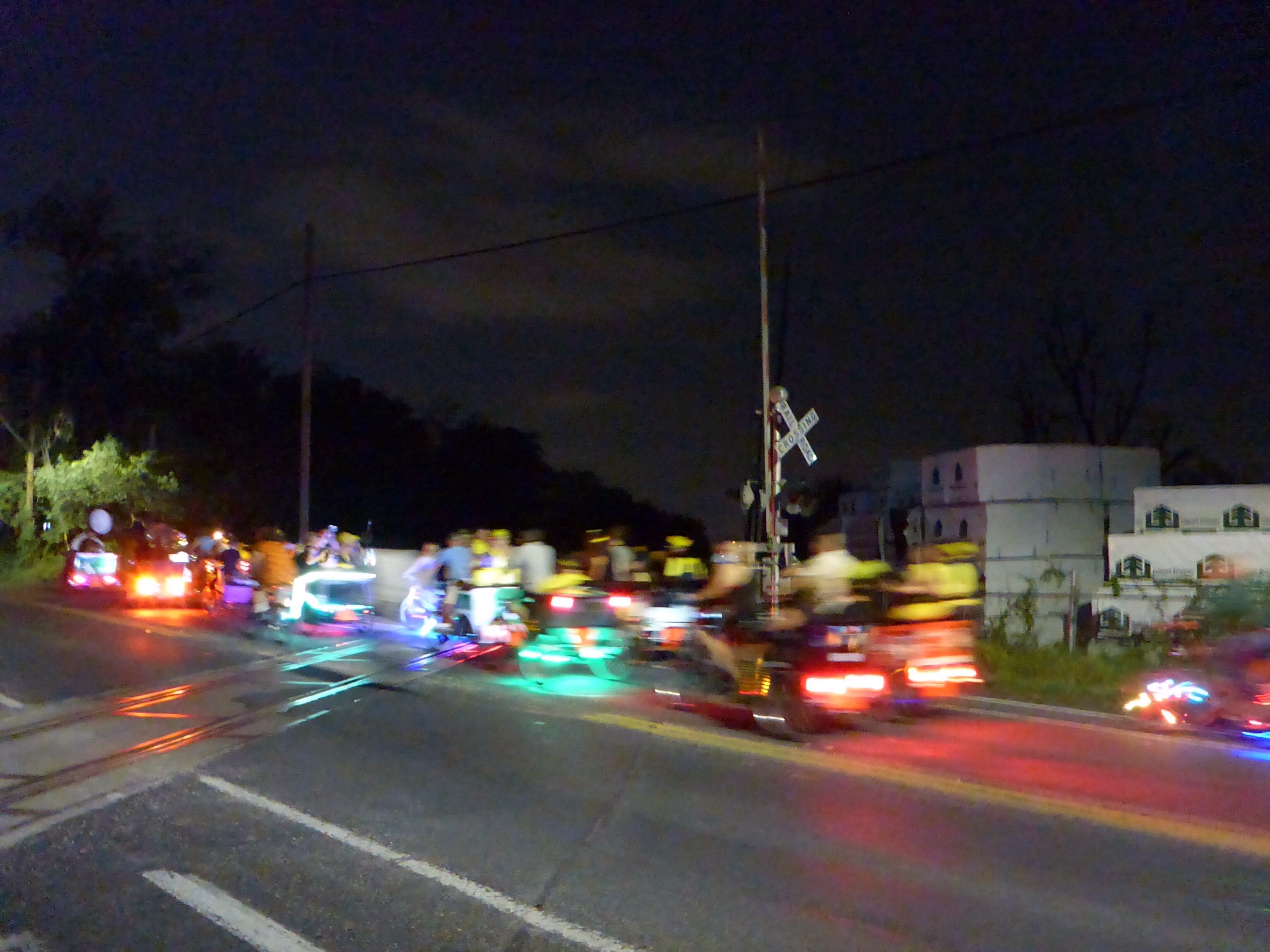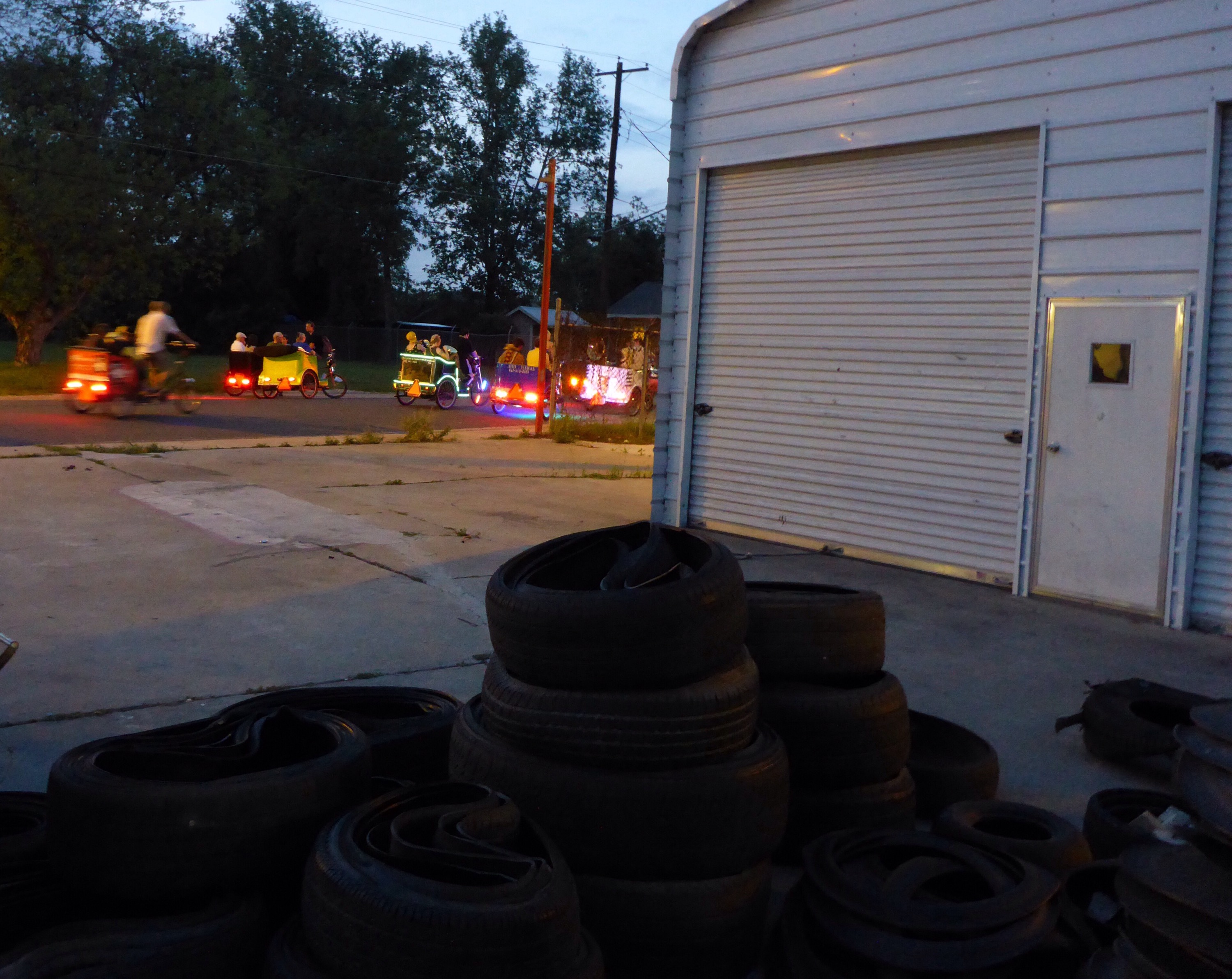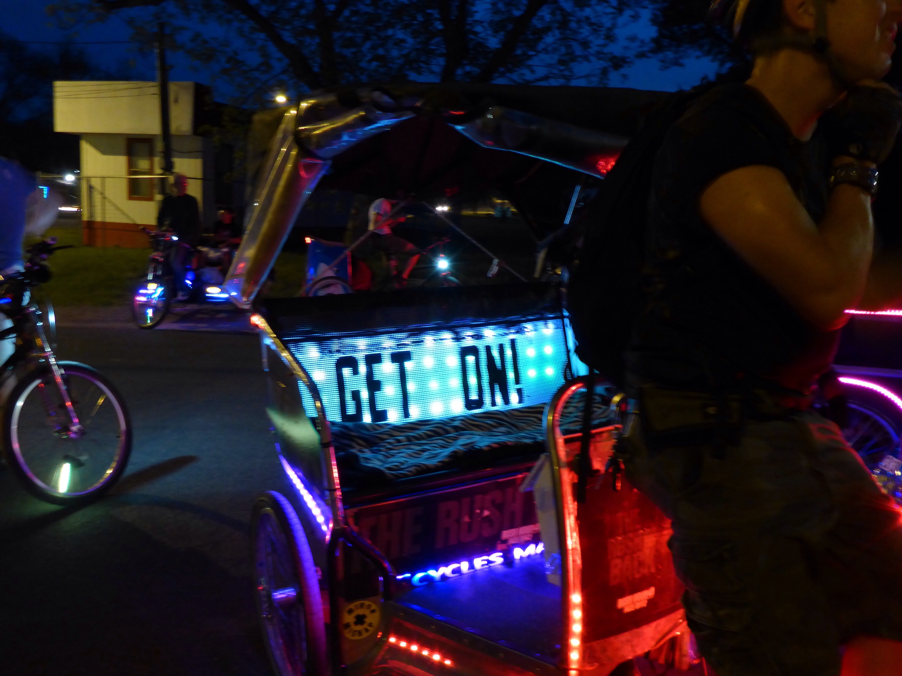 I attended a fundraiser tonight which started off as a pedicab parade. Apparently one of the pedicab drivers was injured just before SXSW this year and was in need of some assistance. The music was supplied by the Minor Mishap Marching Band, but they all rode along on pedicabs while I marched along to keep up with them. It was a blast, and a good way to get in some walking again tonight.