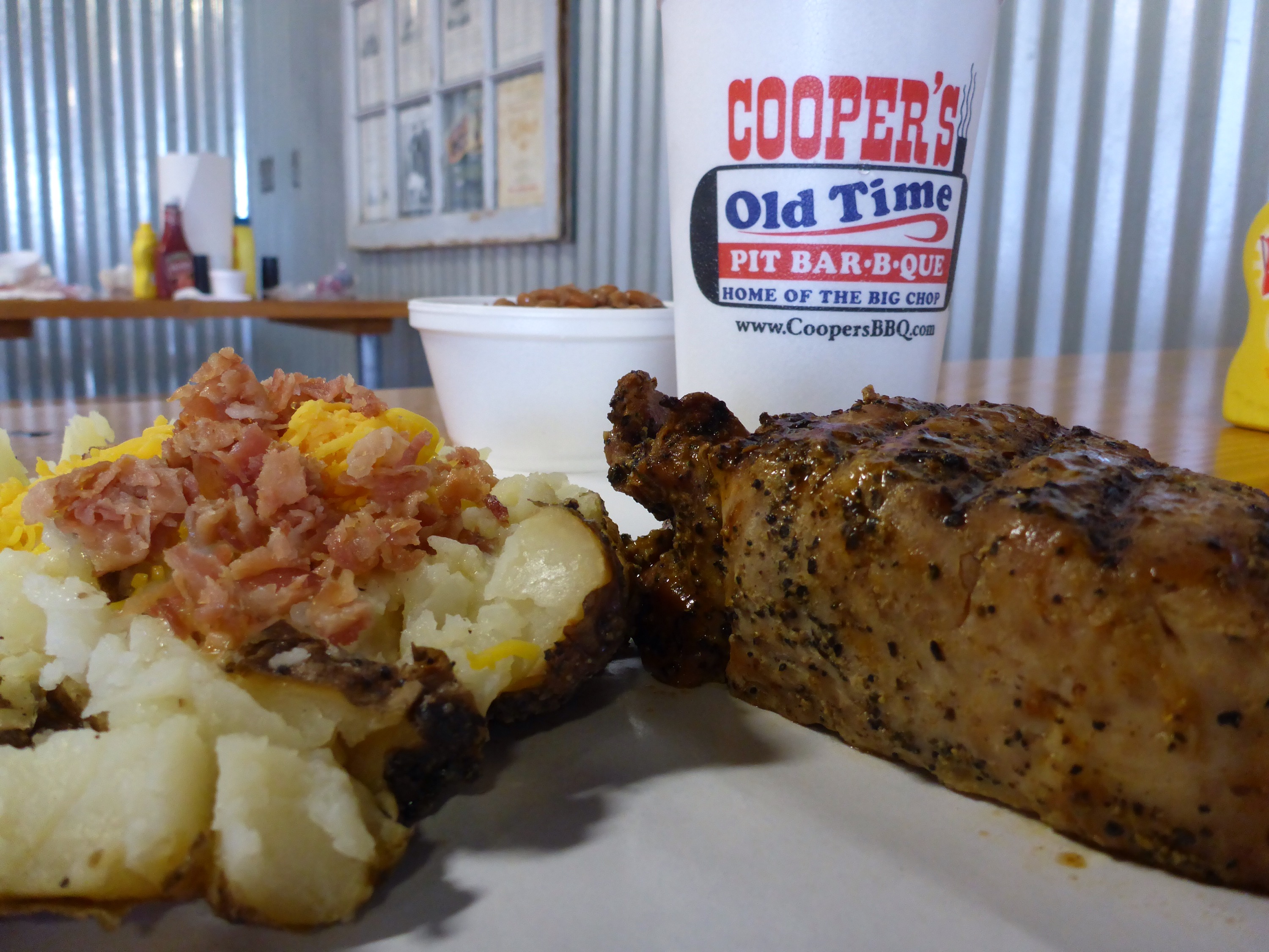 Today’s lunch was at Cooper’s Bar-B-Que in New Braunfels. They had a weekend special consisting of a boneless pork chop and a baked potato. I added some beans, pickles, and an iced tea to make it an awesome meal. This is a great BBQ joint if you find yourself in the area.