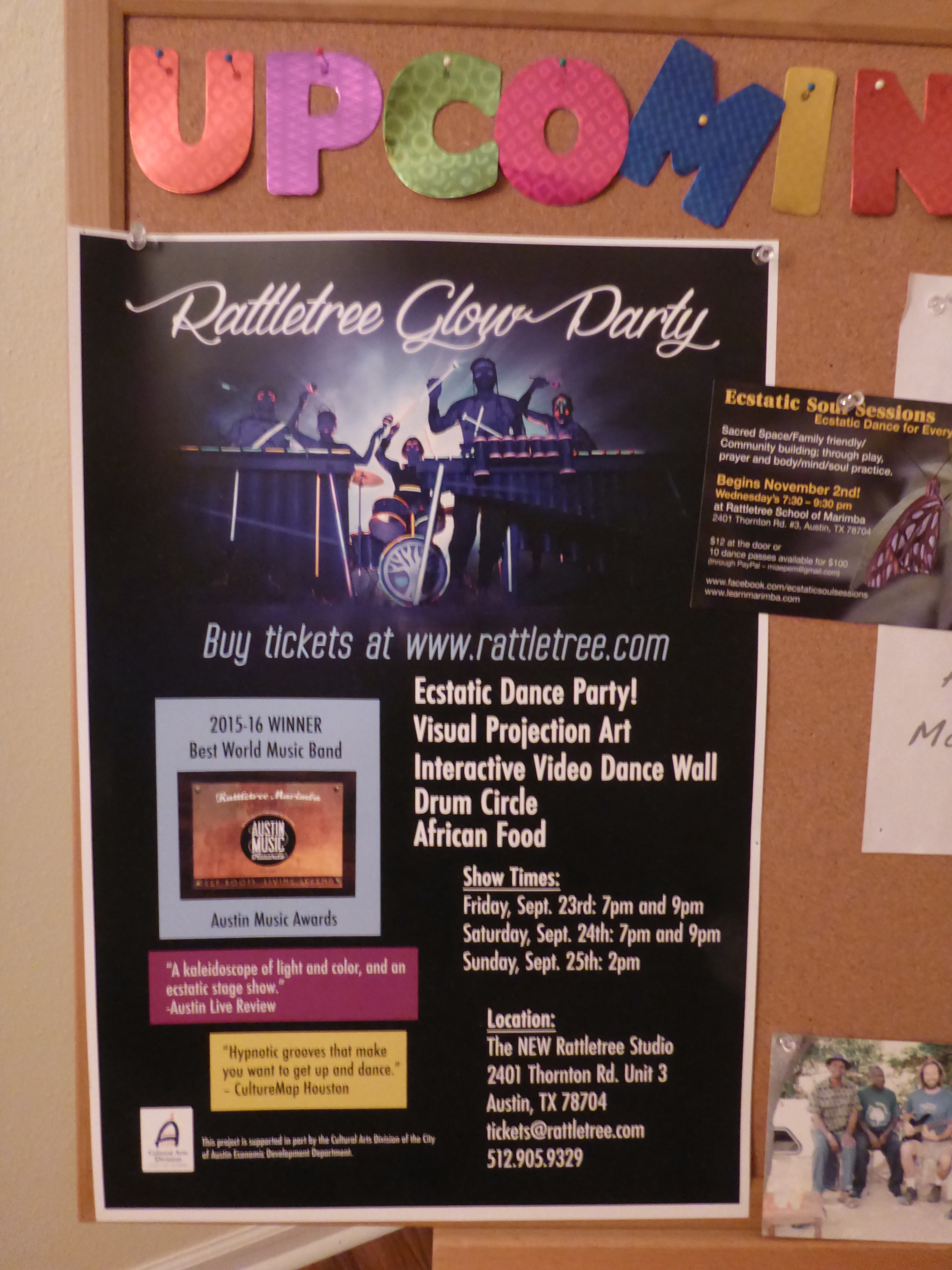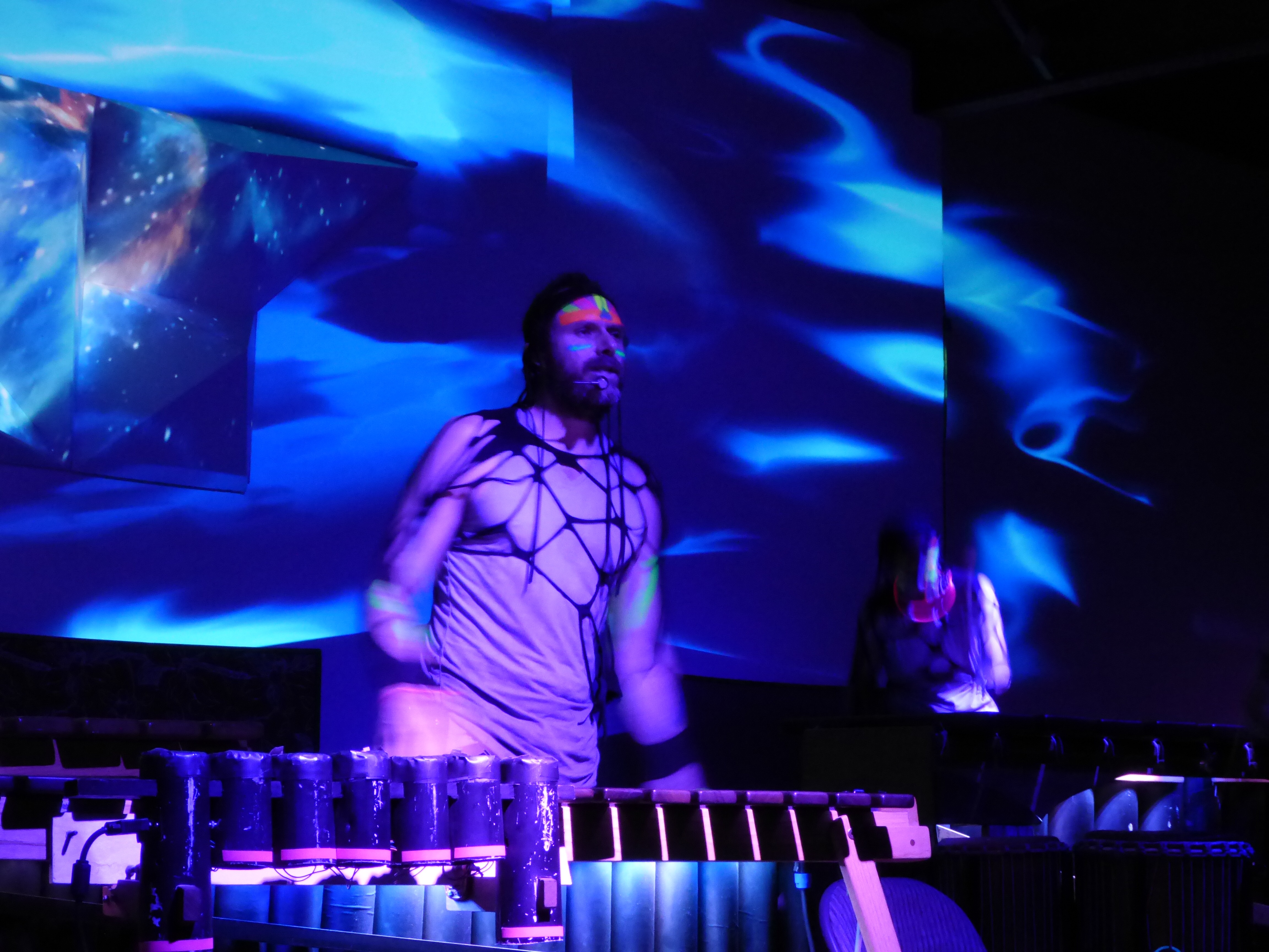What happens at the Rattletree Glow Party, you might ask? You put on your glow stuff, and maybe get your face painted. You take off your shoes at the door as per the rules. Then you can chill out and listen to DJ Happy Happy James, or get your dance on. When the marimba music starts, you are in musical heaven. Joel Laviolette and his band are so much fun. It was a great celebration of the new studio home for the Rattletree School of Marimba.