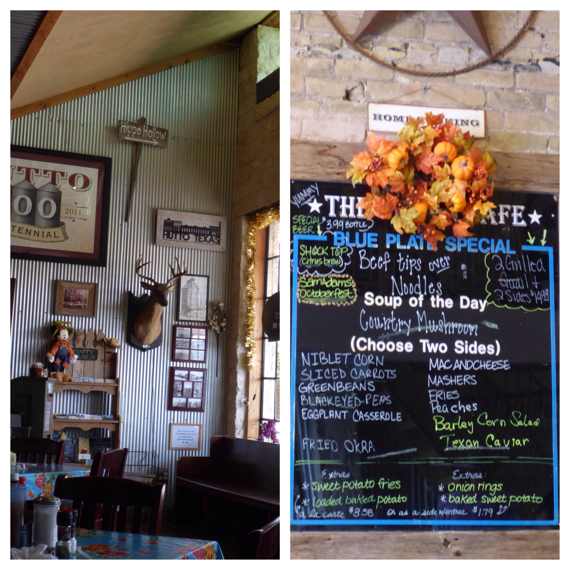 For lunch today, we headed over to the Texan Cafe in Hutto. My friends got chicken fried steaks and I got the chicken fried chicken with niblet corn, fried okra, and iced tea. As you can see from the menu board, this place is pretty Texas. But the best part is the pies – yes, the pies! What place do you know of that has a pie happy hour? The Texan Cafe has that. From a fully stocked pie case, I chose the Snickers Pie and it was totally yummy. We paid for our food, waddled out of the place and I was unsuccessful in getting a photo of my friends on top of the Hutto Hippo (the town mascot). Next time… 🙂