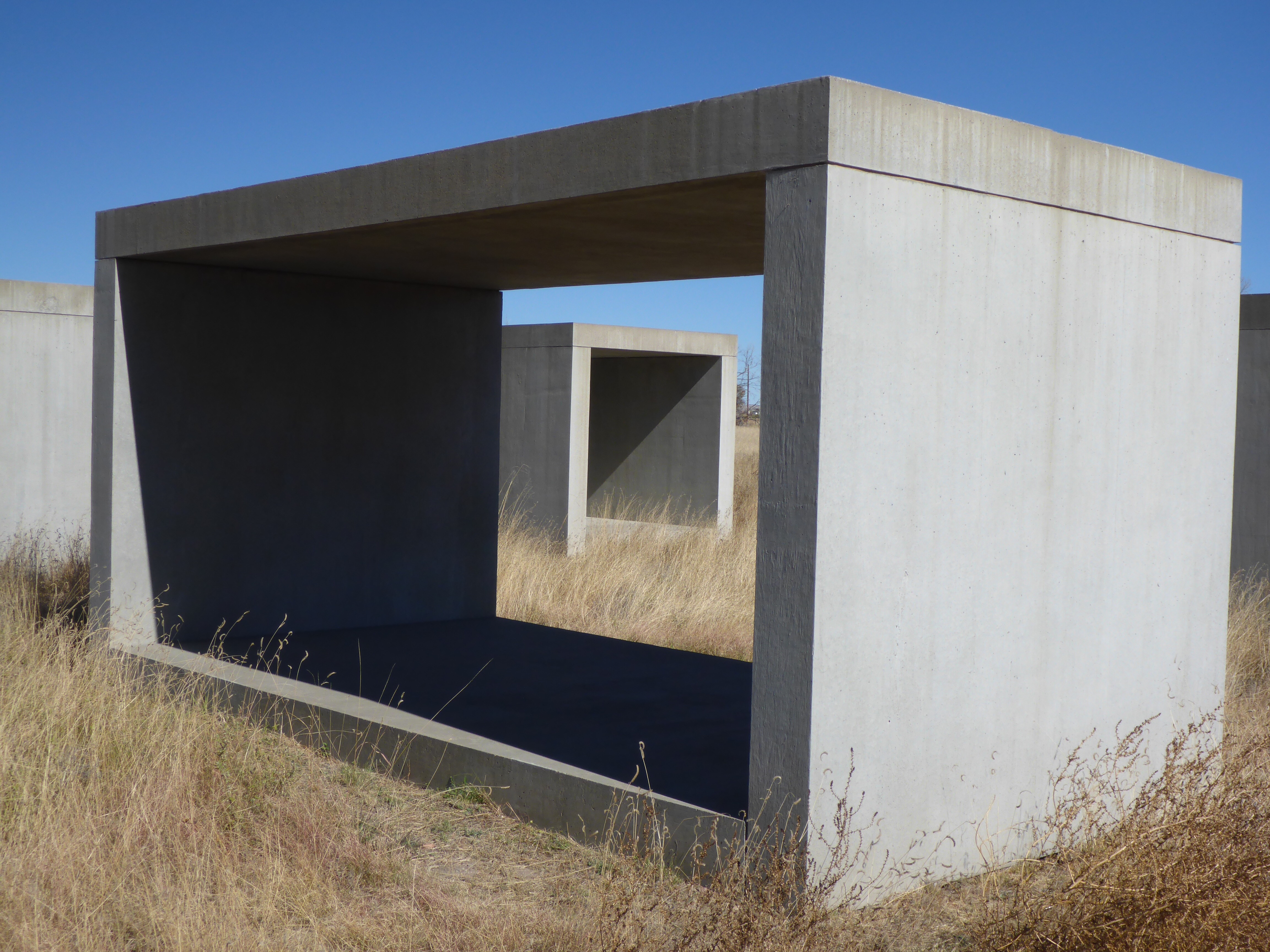 Another Art Installation from Donald Judd. Take a walk along the border of the property at The Chinati Foundation to admire these concrete shapes and the surrounding scenery. If you look closely in the next to the last photo, you can see the Marfa Water Tower and the dome of the Presidio County Courthouse. 🙂