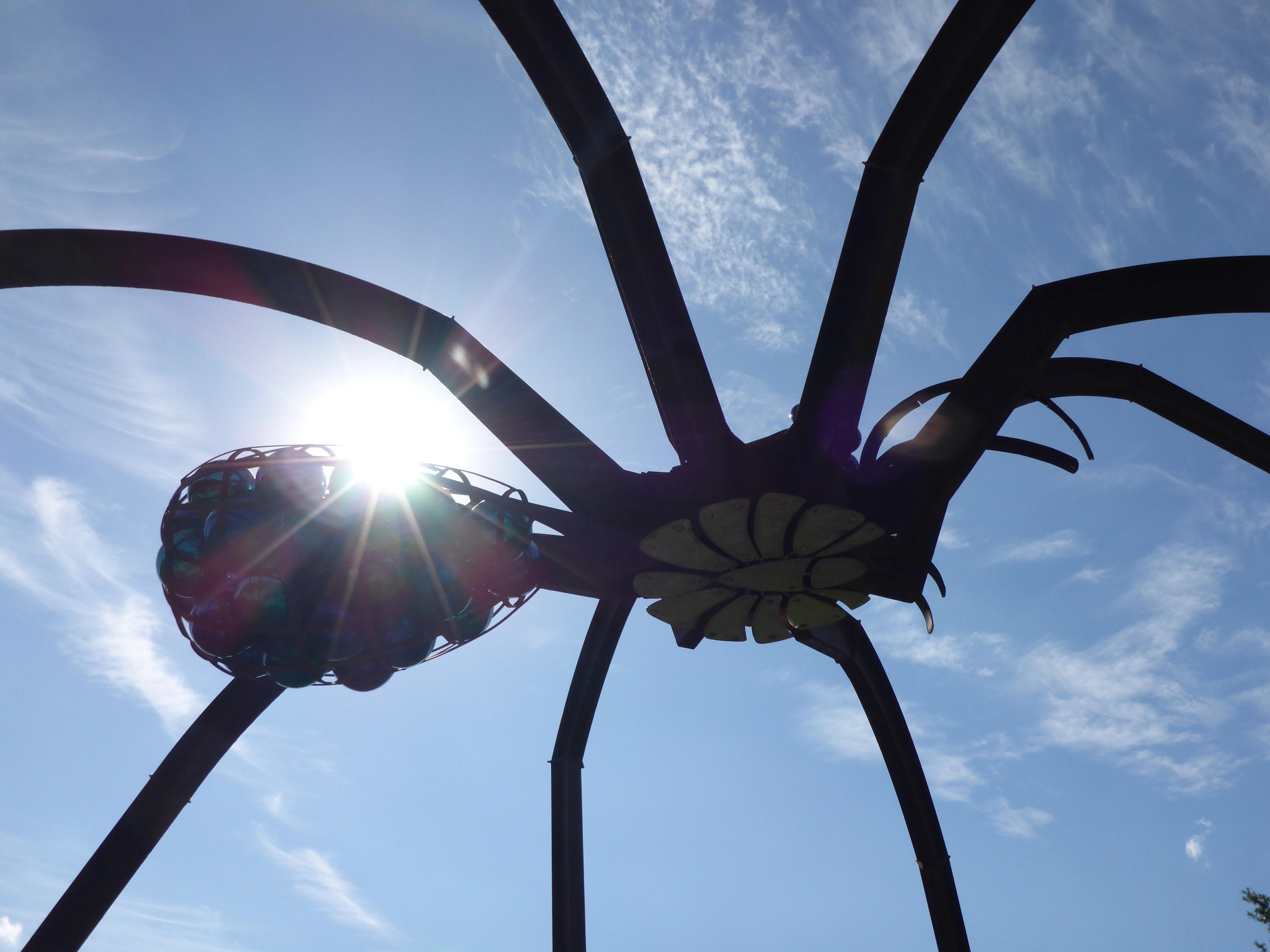 If you walk the correct path at Mueller, you will find yourself beneath a giant Spider. The sculpture is called “Arachnophillia“, and was created by the artist Dixie Friend Gay. Today, the temperature was about 90 degrees which made for a hot walk in the direct sunlight. The sunflowers were loving it and the baby birds were using the spider for shelter as they chirped for dinner.
