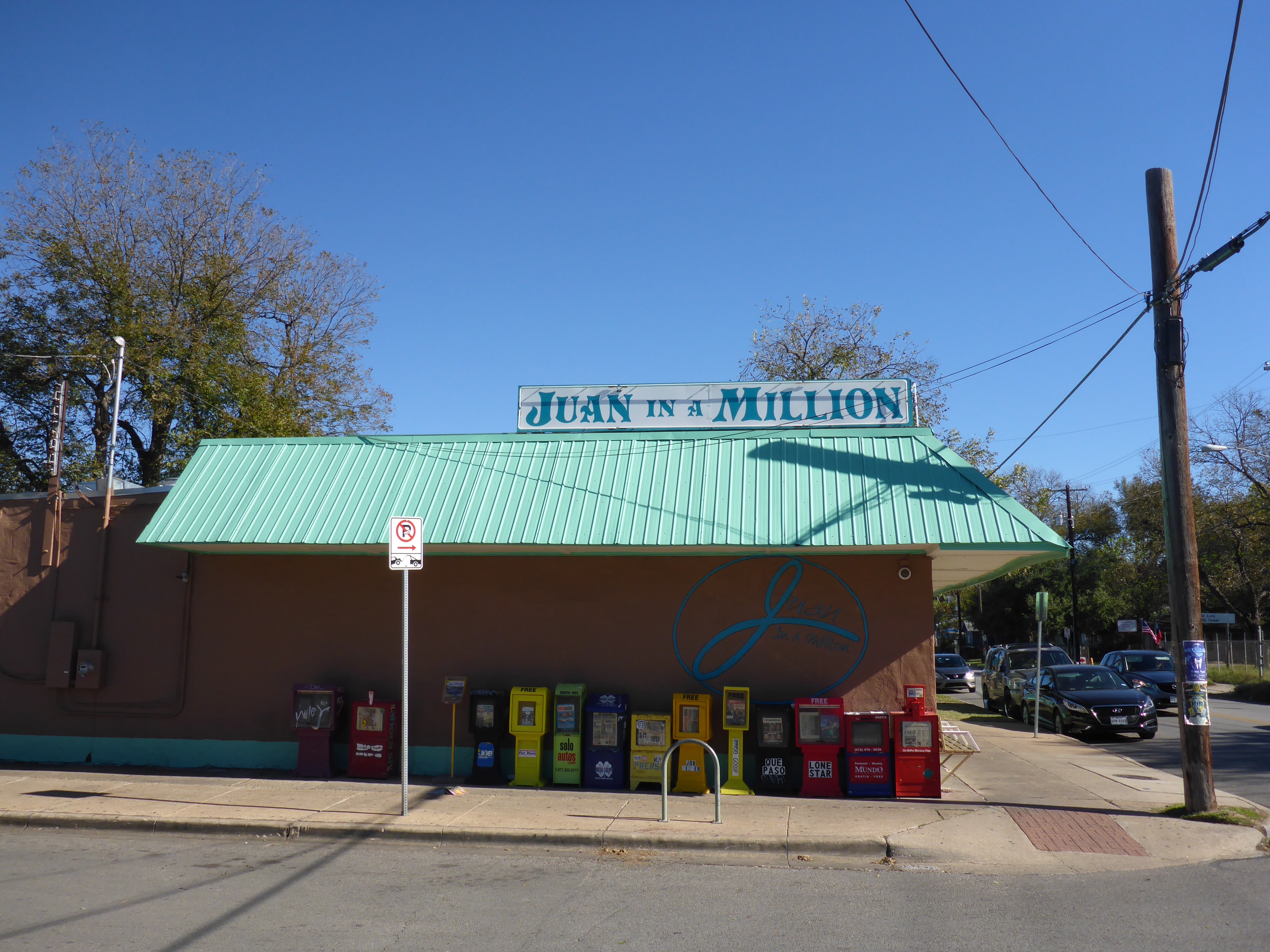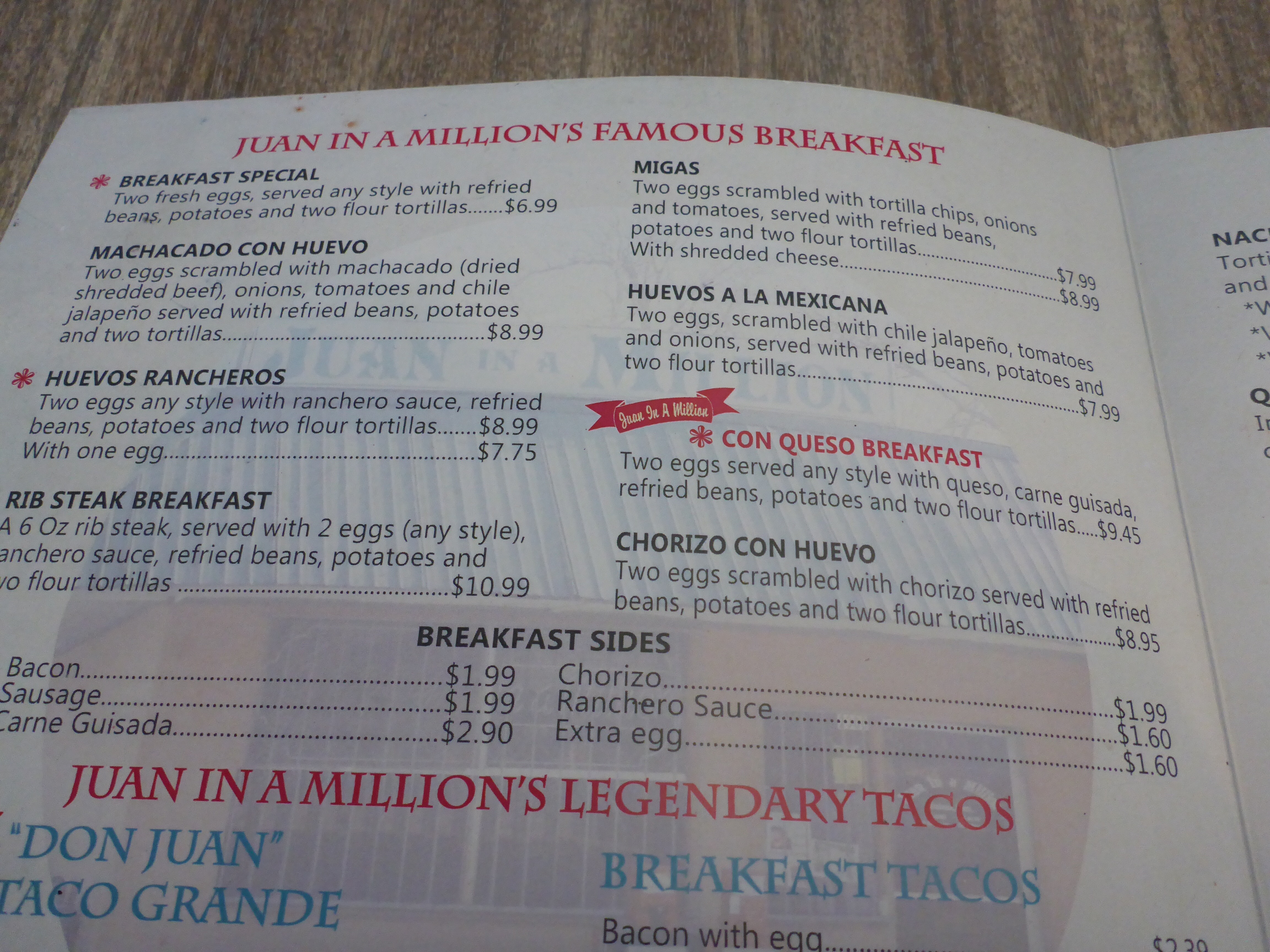 Today’s breakfast was on the East side of town. Juan in a Million is a Tex-Mex Restaurant that opened in 1980 on East Cesar Chavez, and is still going strong. I ordered from the breakfast menu and chose the Con Queso Breakfast which includes “Two eggs served any stle with queso, carne guisada, refried beans, potatoes and two flour tortillas”. I’m pretty sure this is a healthy way to start your day…