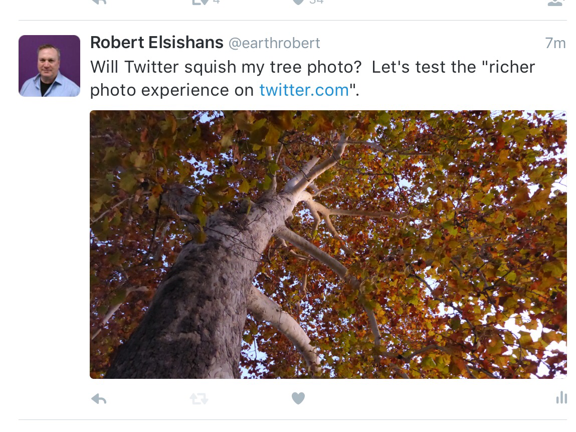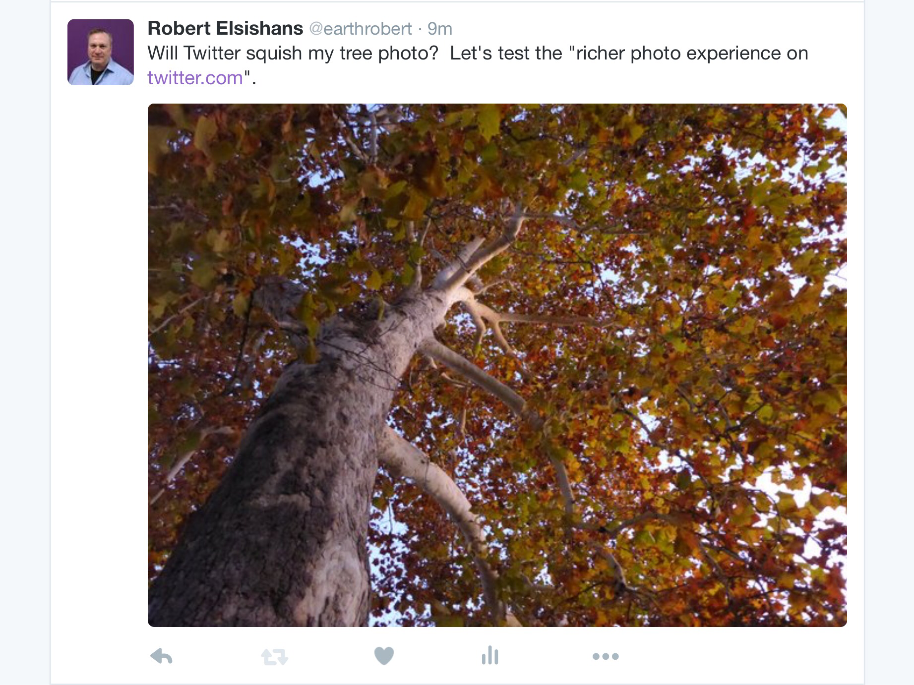So Twitter is taking a small step in the right direction. Has it ever annoyed you that your Twitter feed only showed part of a photo and you had to tap on the photo to view the full image? So, Twitter announced that they are refining the media experience. When I tested my tree photo today, it appears normally on the Twitter desktop site, but it appears cropped in the Twitter App for iOS. Here’s hoping they can also make the App more visually appealing so I will become more likely to tweet photos directly instead of instagramming them.