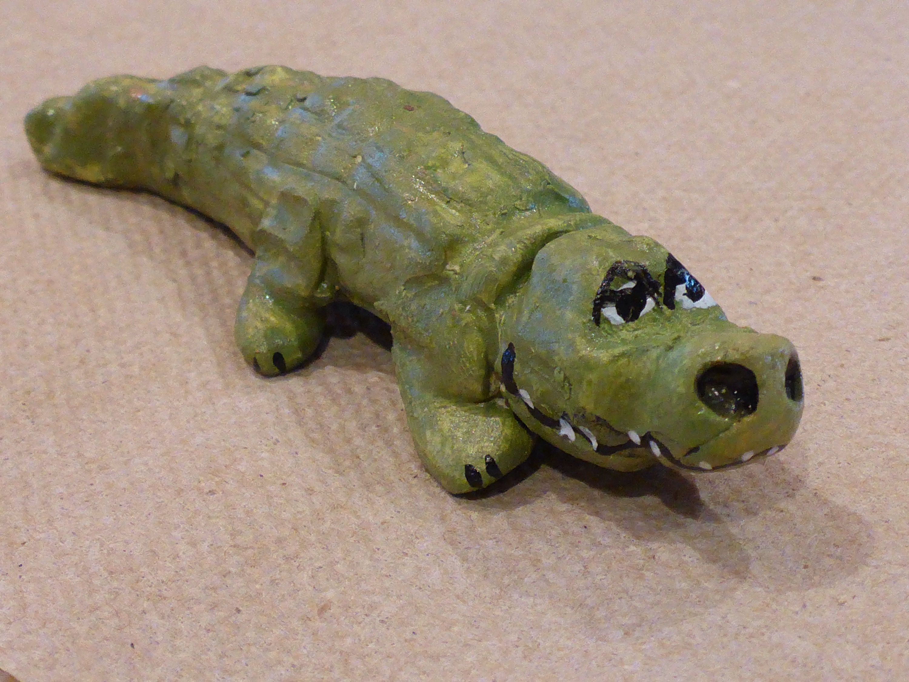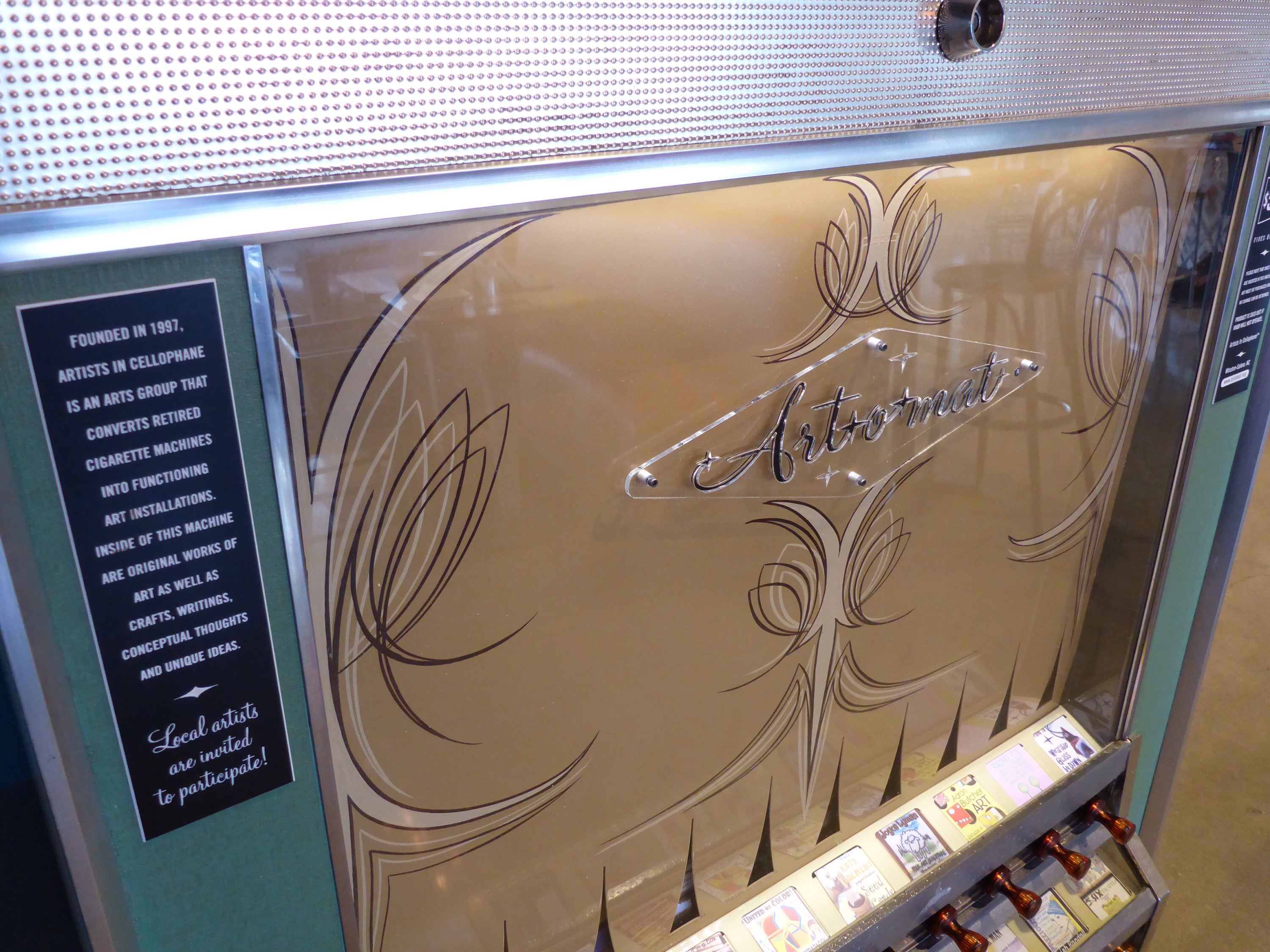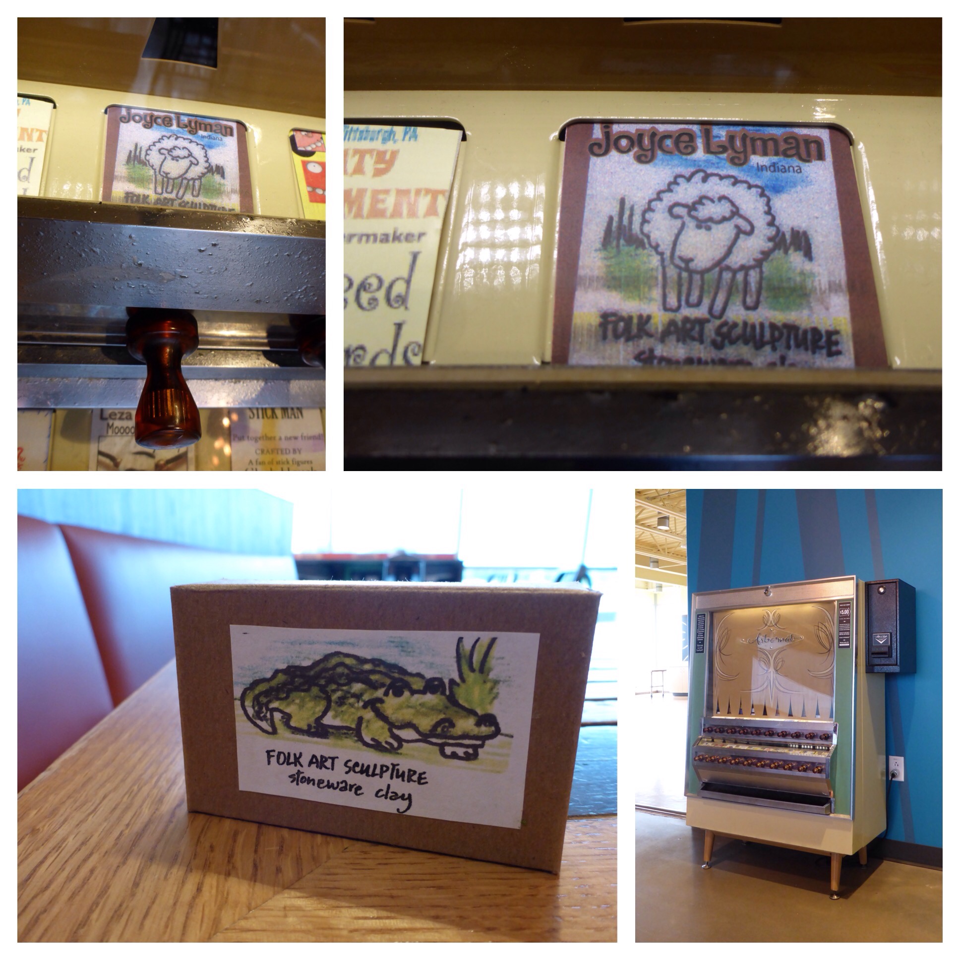 It is raining off and on in Austin today, so I find myself upstairs at Whole Foods eating some soup and salad and watching the storms blow by from the second floor windows. There is this old cigarette dispenser that has been retrofitted as an art machine – the Art*o*mat. Pretty cool. I was trying to decide between Joyce Lyman’s Folk Art Sculpture and “Stick Man – Put together a new friend”, and the Folk Art won because a new friend might turn out to be too needy. I put in my hard earned dollars, pull the handle, and out slides a groovy alligator in a box. Don’t be jealous. Joyce Lyman might make an alligator for you too if you ask nicely…