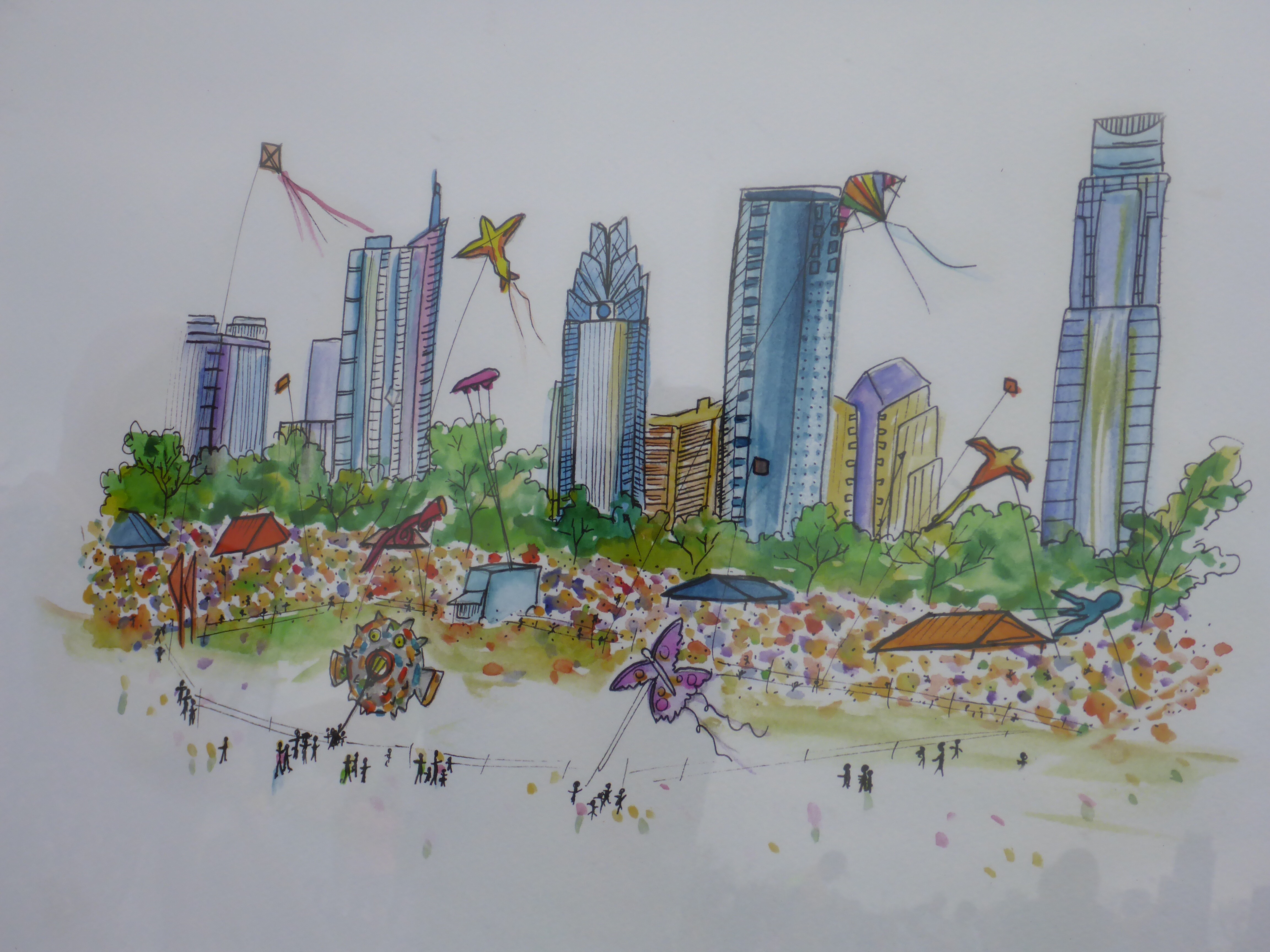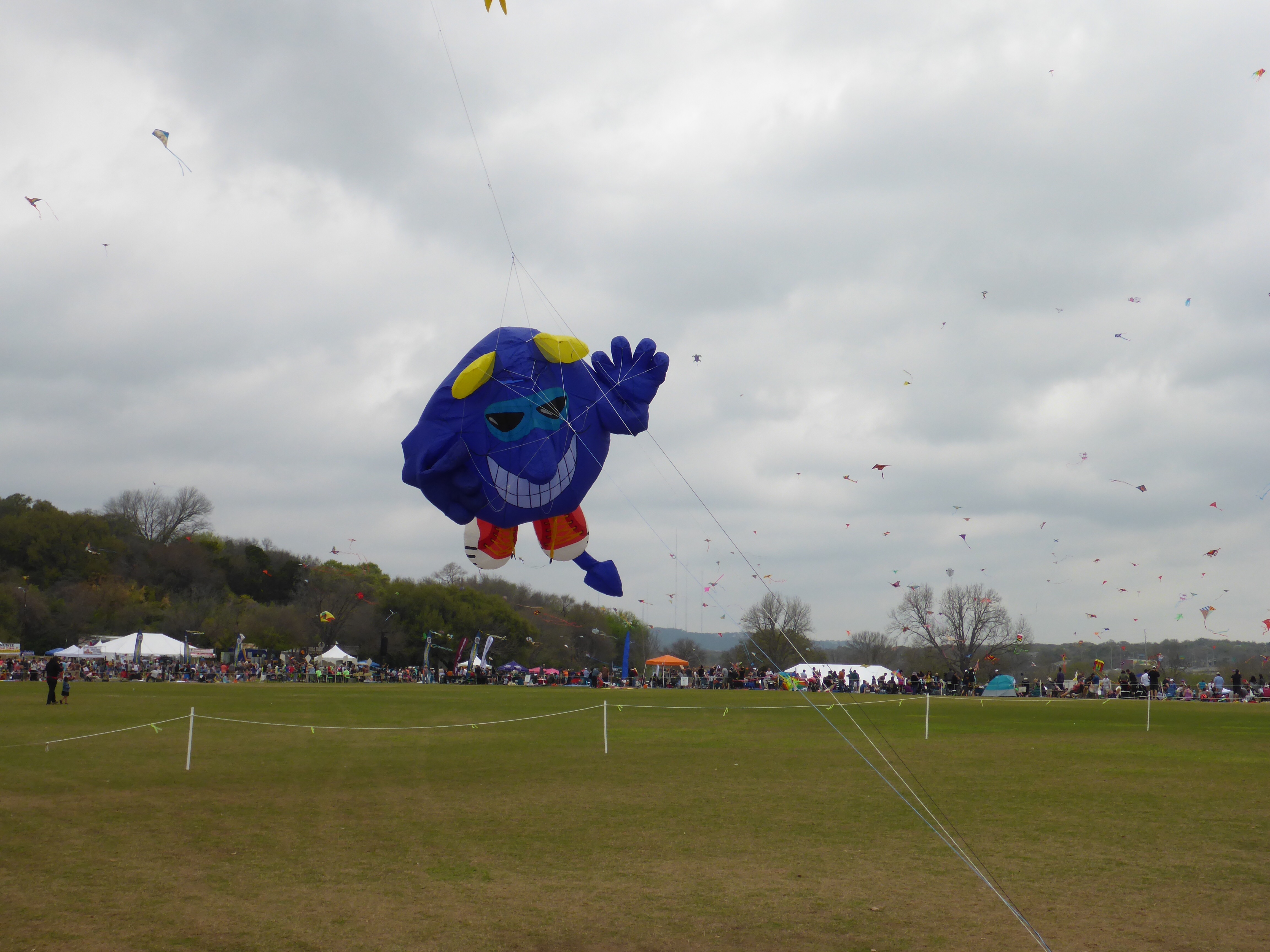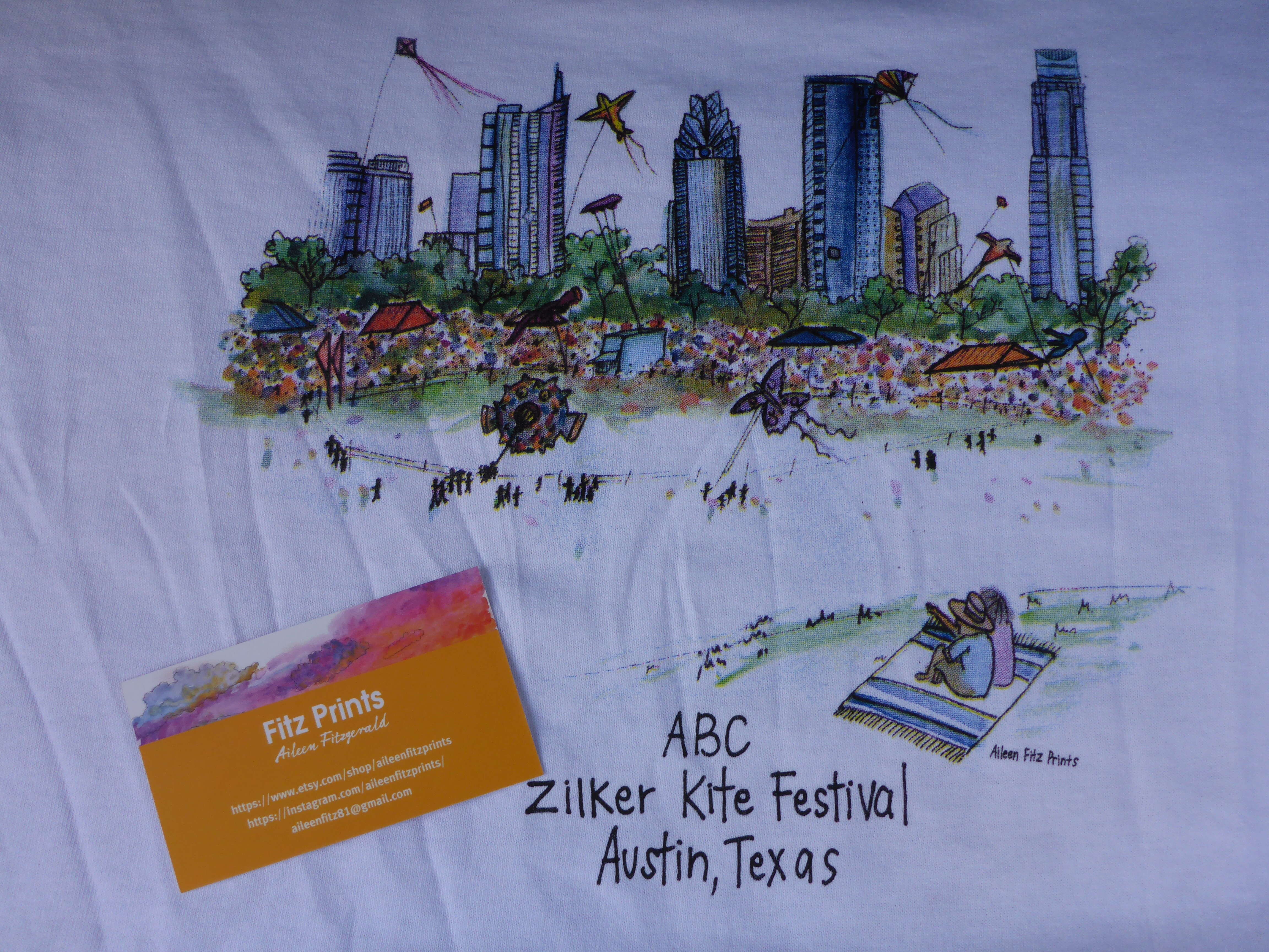 The Zilker Kite Festival was as crazy as ever! The weather was a perfect overcast, cloudy, and windy day. There were tons of people, dogs, kites everywhere, bubbles, a biplane buzzing by, food trucks, beverages, kettle corn, free ice water, t-shirt sales, and art. I met the artist who submitted the design for the official t-shirt, Aileen Fitzgerald, and she was super nice. I thought her artwork really captured the spirit of Austin. All in all, it was a most successful Kite Festival.